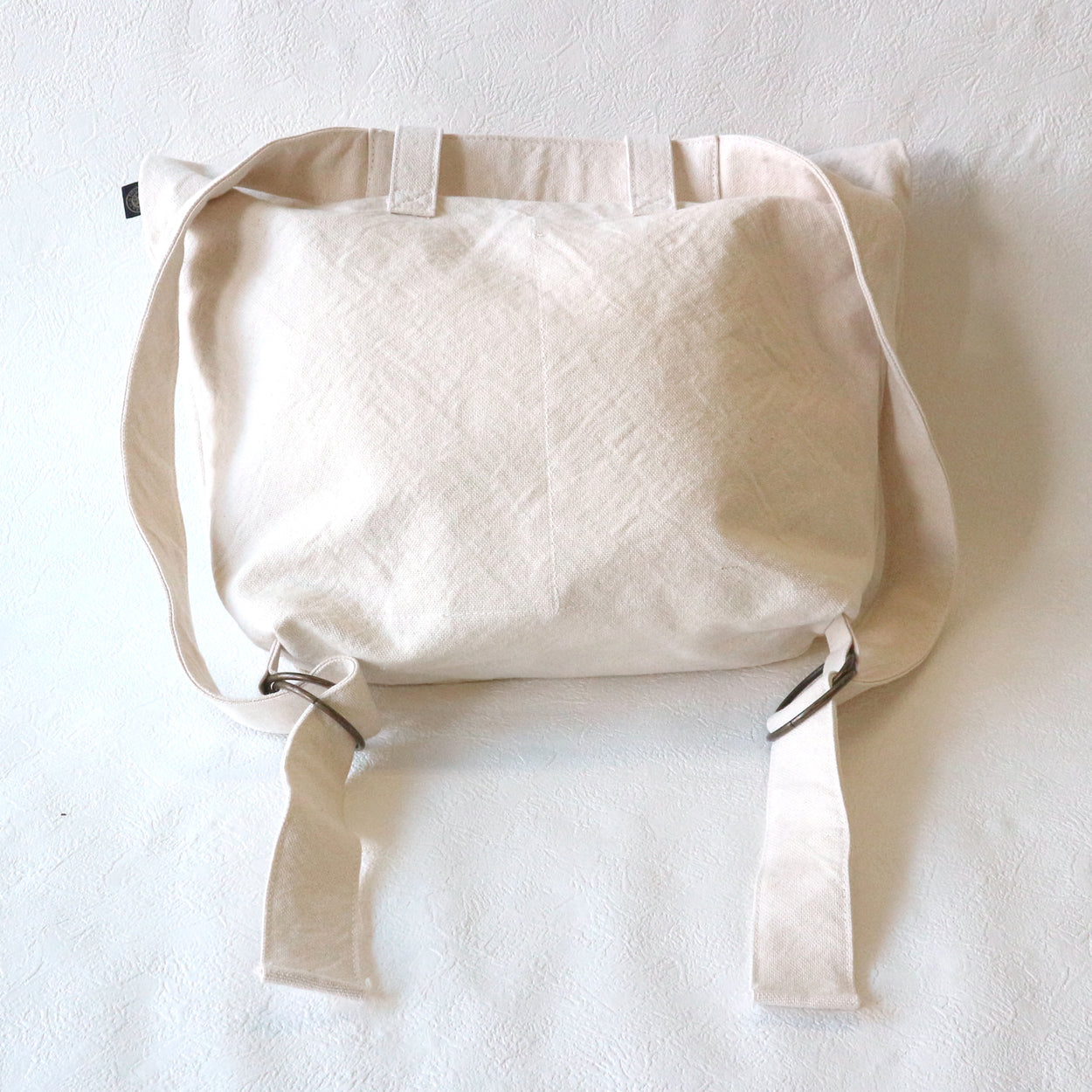ショルダー調節のリングや、折り曲げて止める口のシルエットが個性的。北欧のミリタリーバッグをベースにリュックサックを作りました。口が広く、スナップボタンで深さを調節できるのが嬉しい。【2023年秋にリニューアルしました】