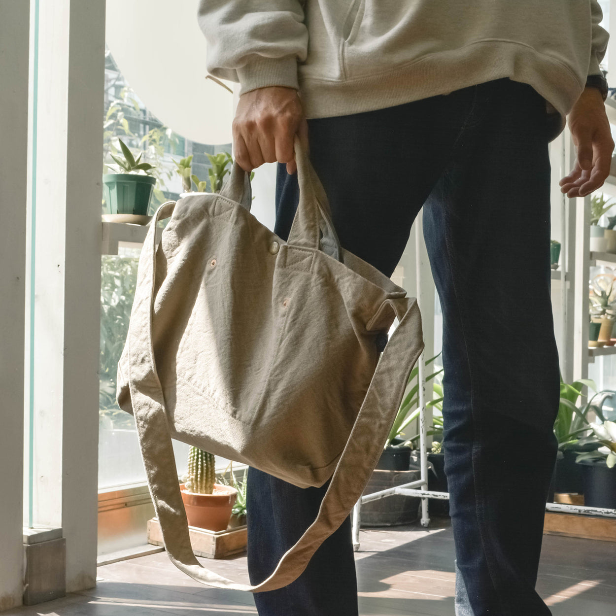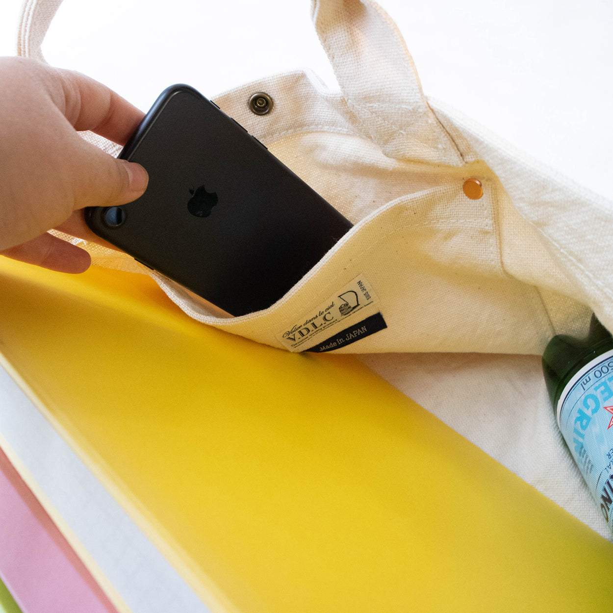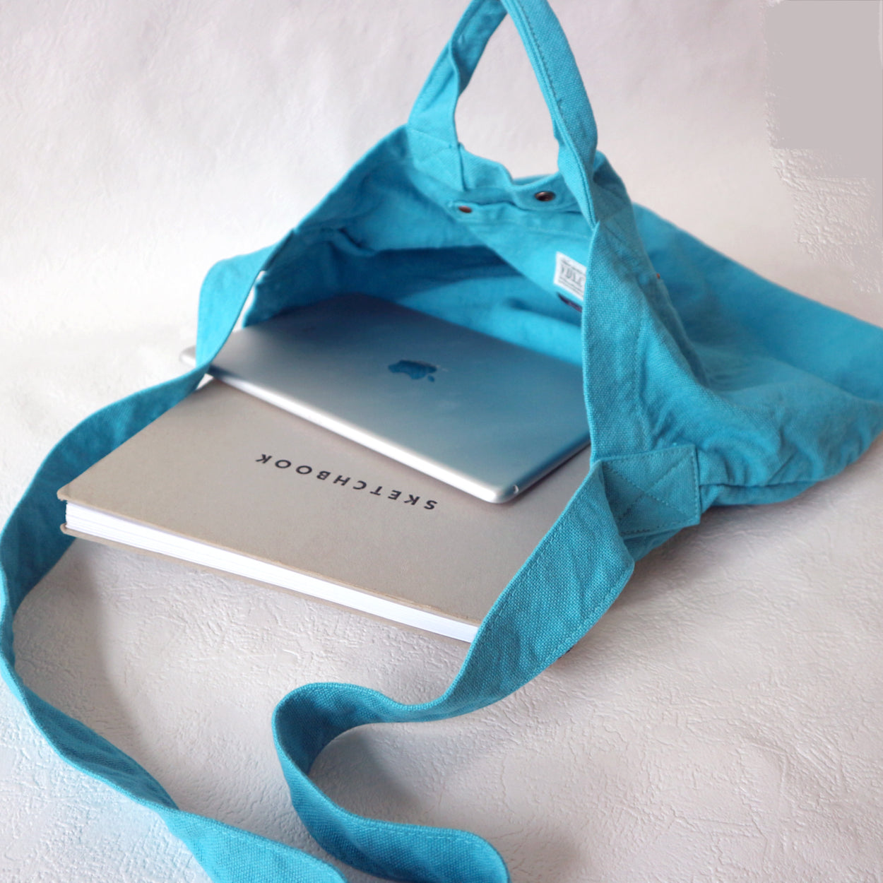 お客様の声からできた、横型トートバッグ。A4サイズが横向きに入り、手提げでも肩がけトートでも使える二種類の持ち手がついています。