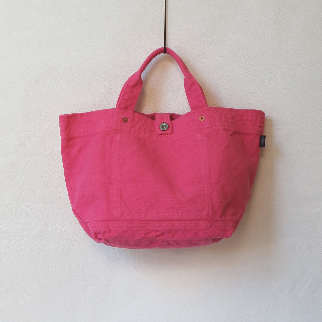 「ちょっとそこまで♪」気軽に持てて、たくさん入るキャンバスの手提げバッグ。デザインのポイントのステッチとドーナツボタンで、ラフになり過ぎずおしゃれにきまります。