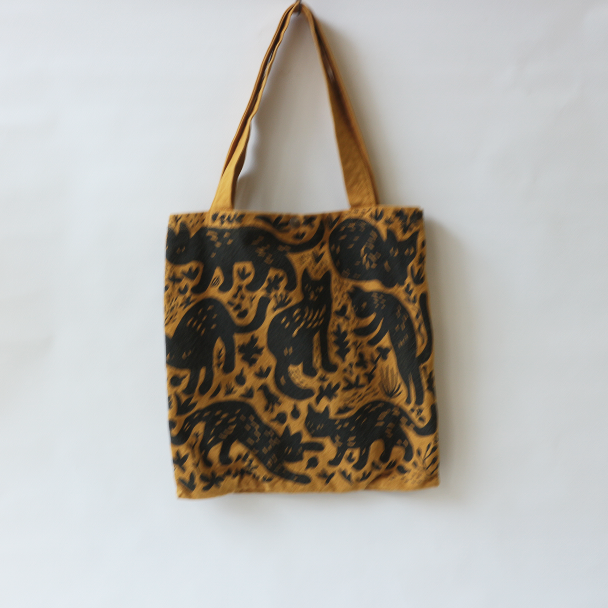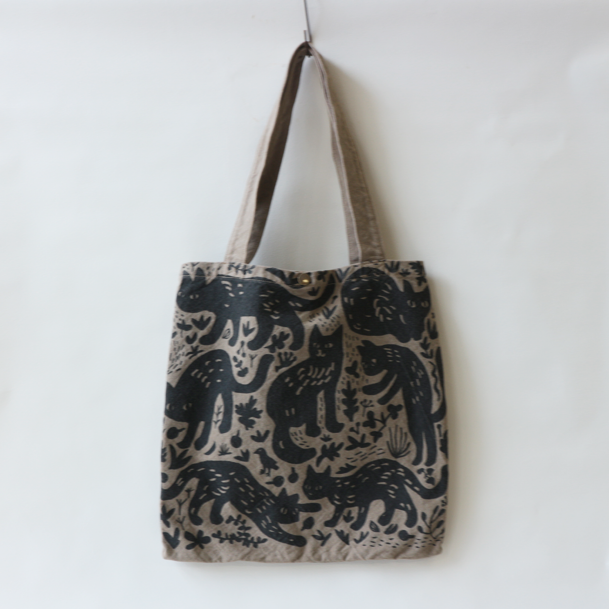 今回のバッグには、「Doucatty」で飼われている黒猫をモチーフにしたデザインをプリント。のびのびとした猫たちの表情やしぐさが愛らしく、遊び心あふれる一品に仕上がりました。