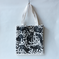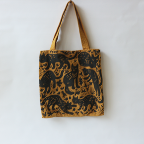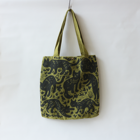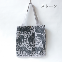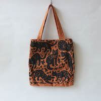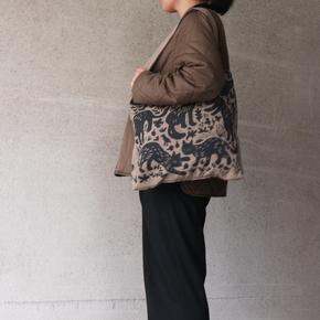 今回のバッグは、帆布生地にプリントを施した後に縫製し、さらに染色するという工程で仕上げています。
