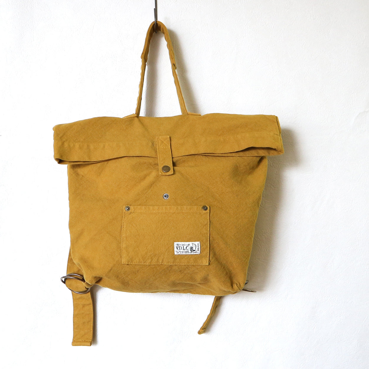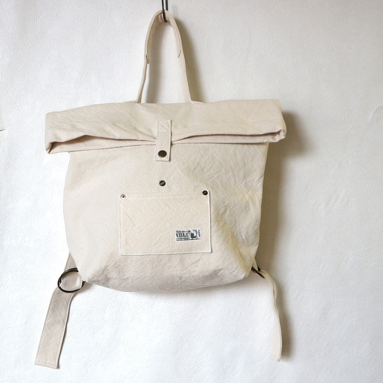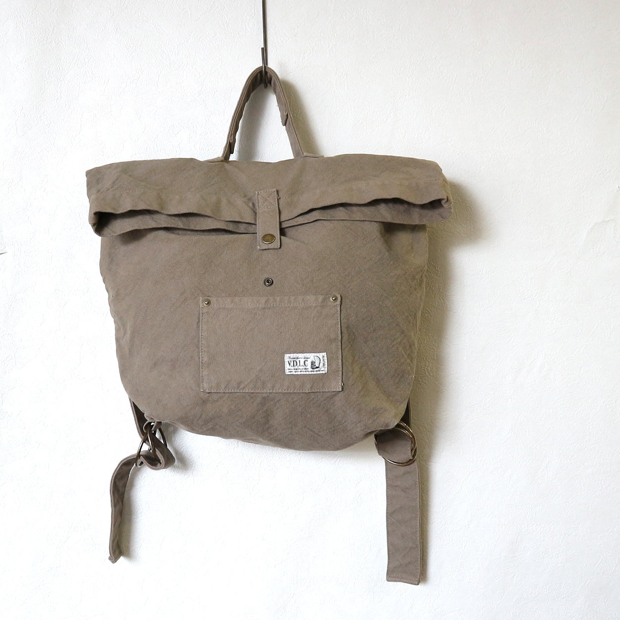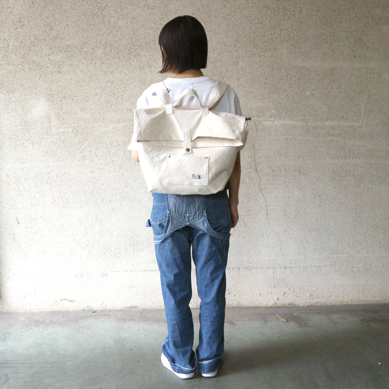 ショルダー調節のリングや、折り曲げて止める口のシルエットが個性的。北欧のミリタリーバッグをベースにリュックサックを作りました。口が広く、スナップボタンで深さを調節できるのが嬉しい。