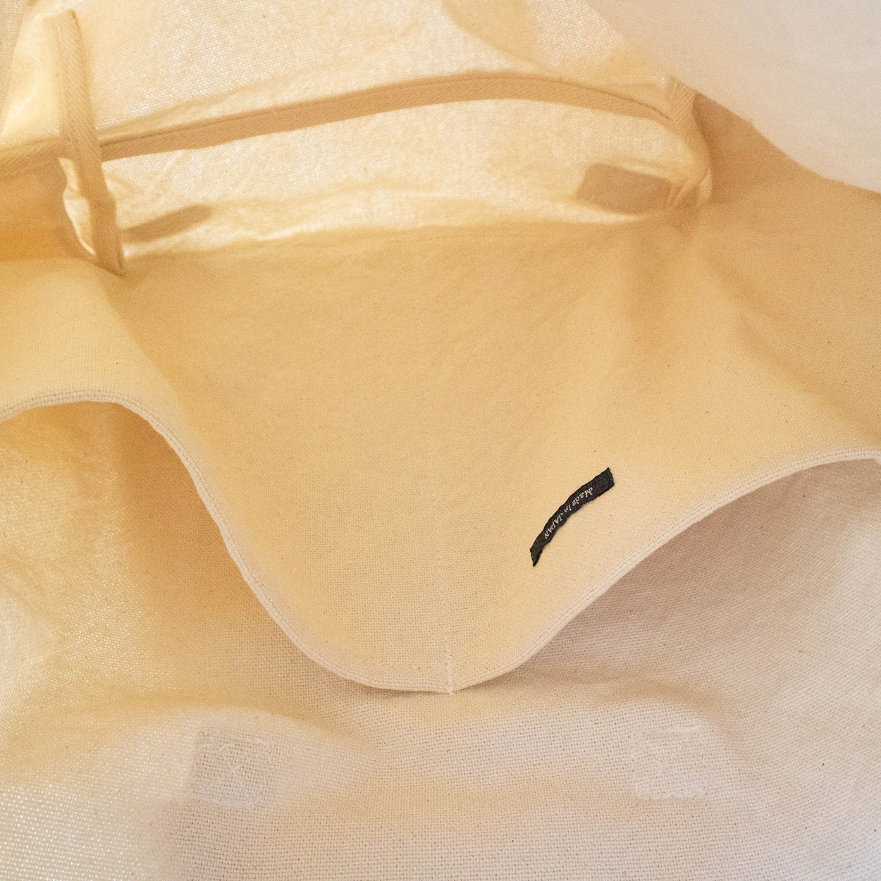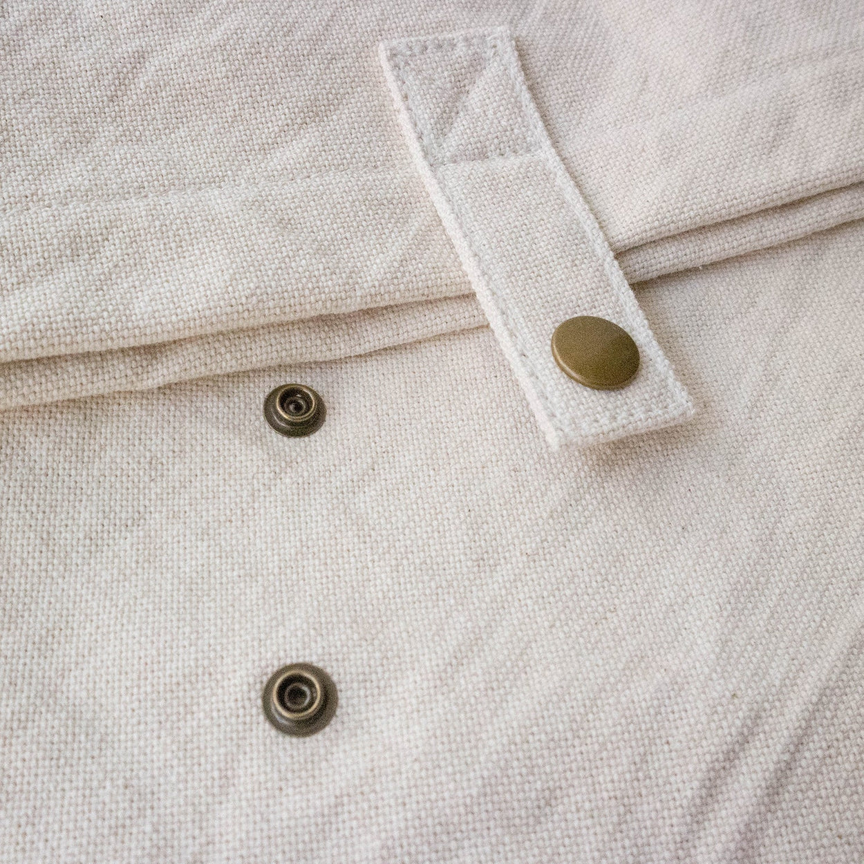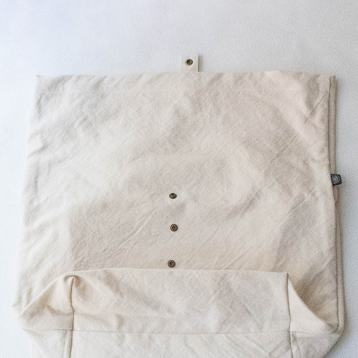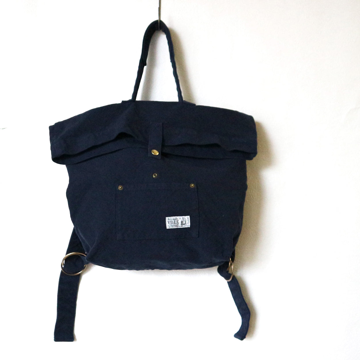 ショルダー調節のリングや、折り曲げて止める口のシルエットが個性的。北欧のミリタリーバッグをベースにリュックサックを作りました。口が広く、スナップボタンで深さを調節できるのが嬉しい。