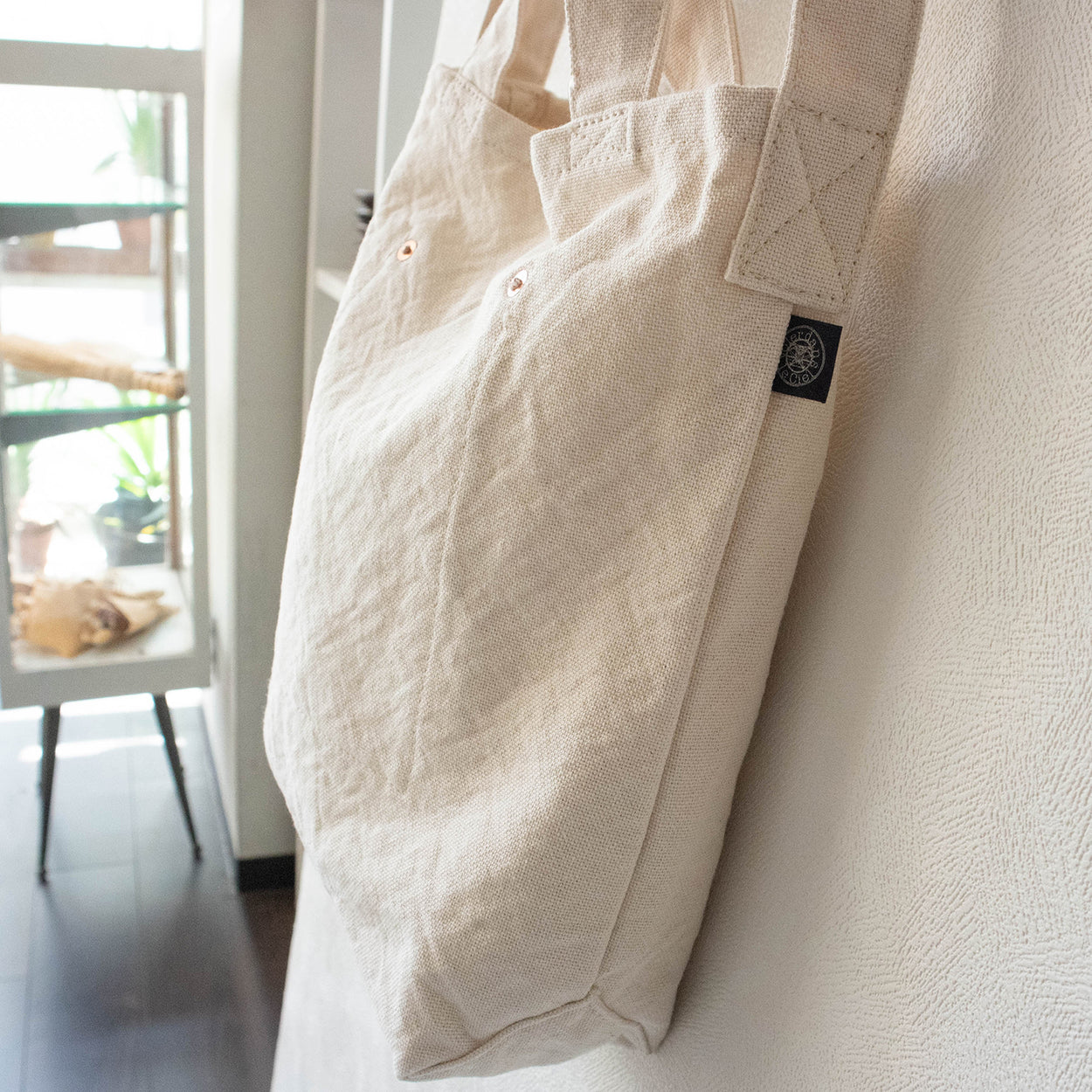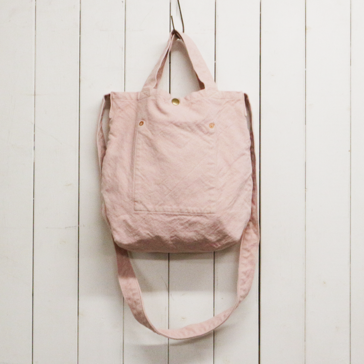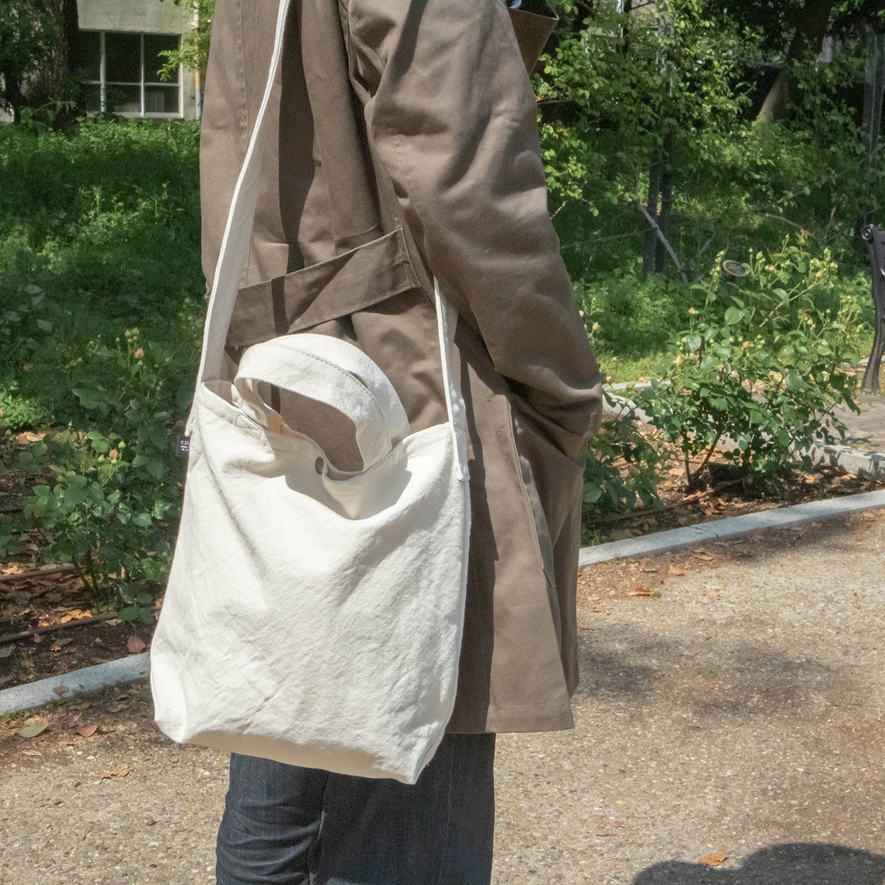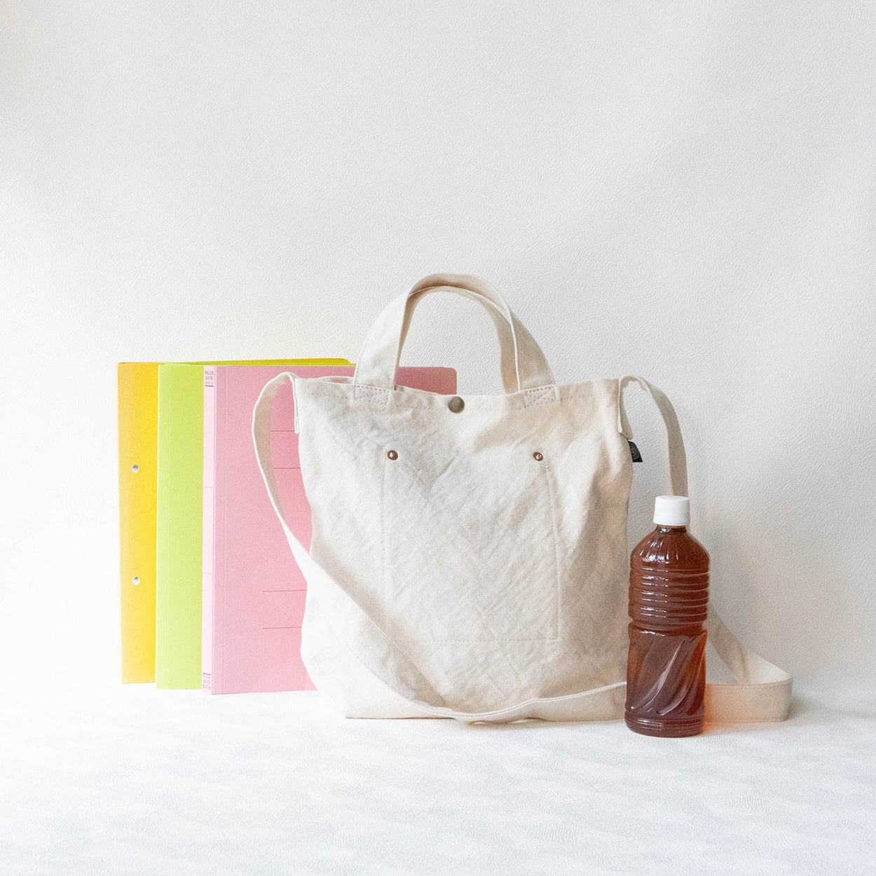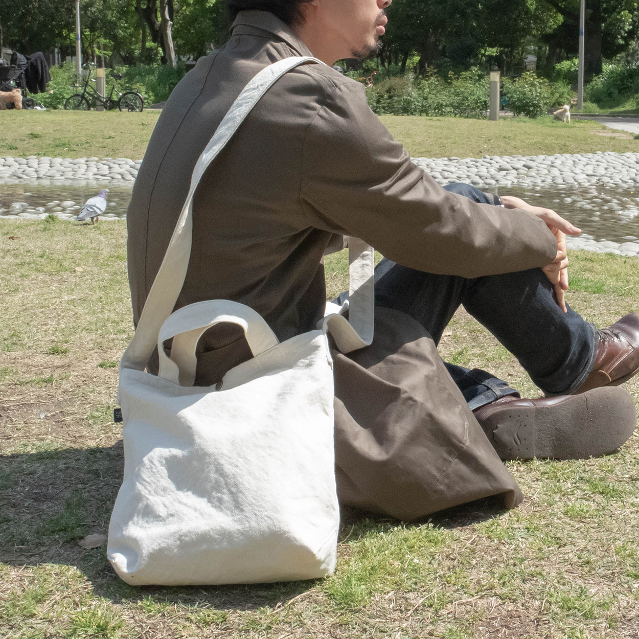 シンプルな形のトートバッグ。A4サイズが縦にぴったり入り、手提げでも肩がけでも使える二種類の持ち手がついています。日常使いに頼りになるカバンです。