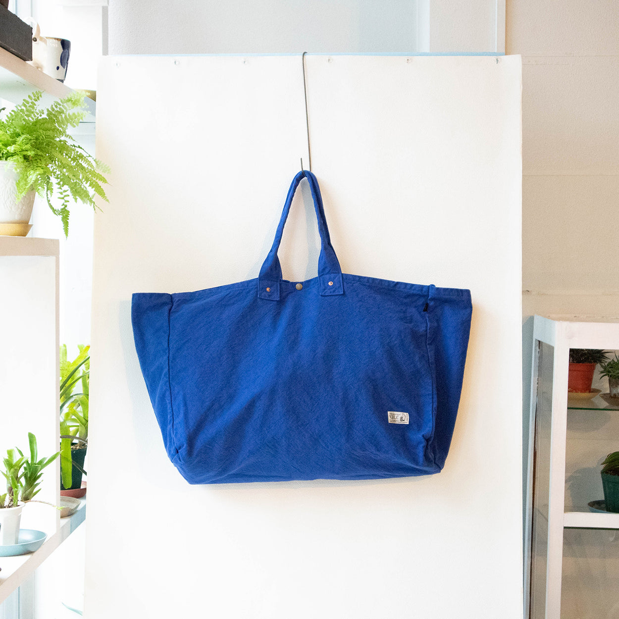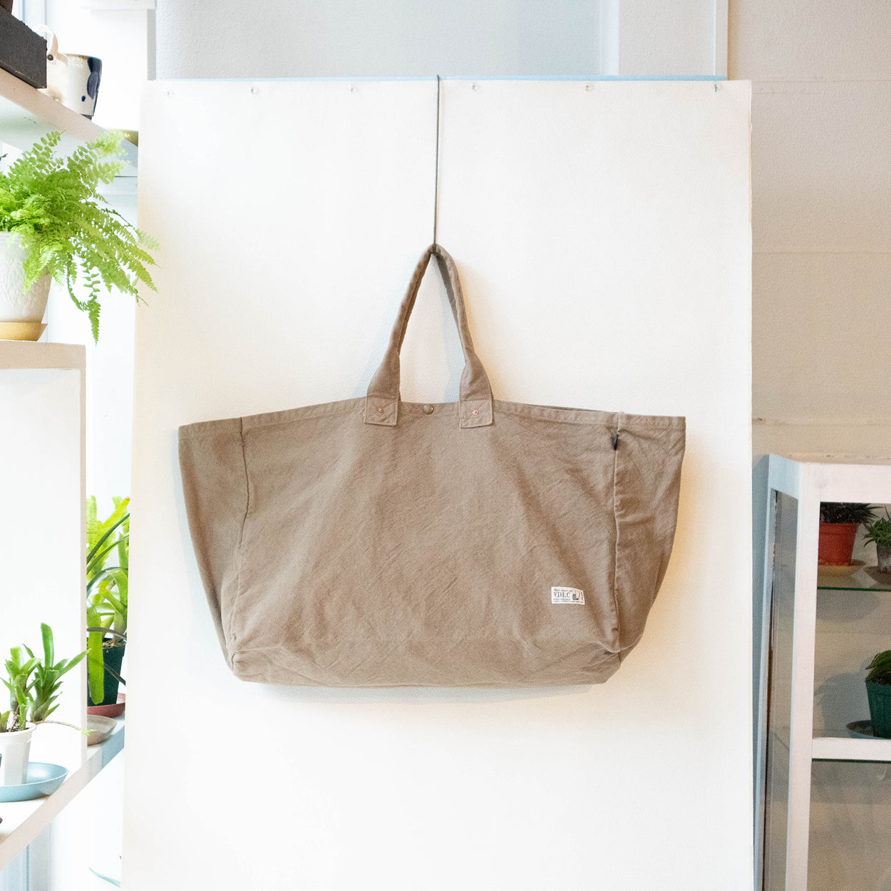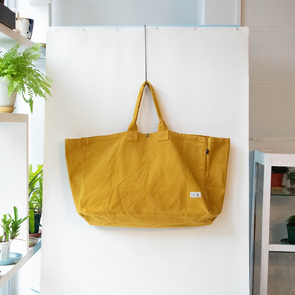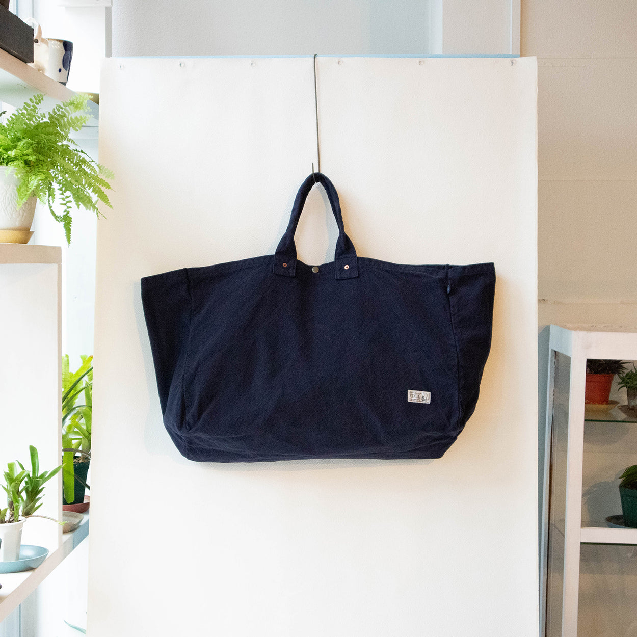 V.D.L.C.バッグの中で一番大きな型です。IKEAのビニールバッグLを普段使いしている方へ。大きい物も、長い物も抜群の収納力で持ち運べます。軽くて丸洗い可能の、丈夫な倉敷帆布の生地を使用した大容量のカバンです。