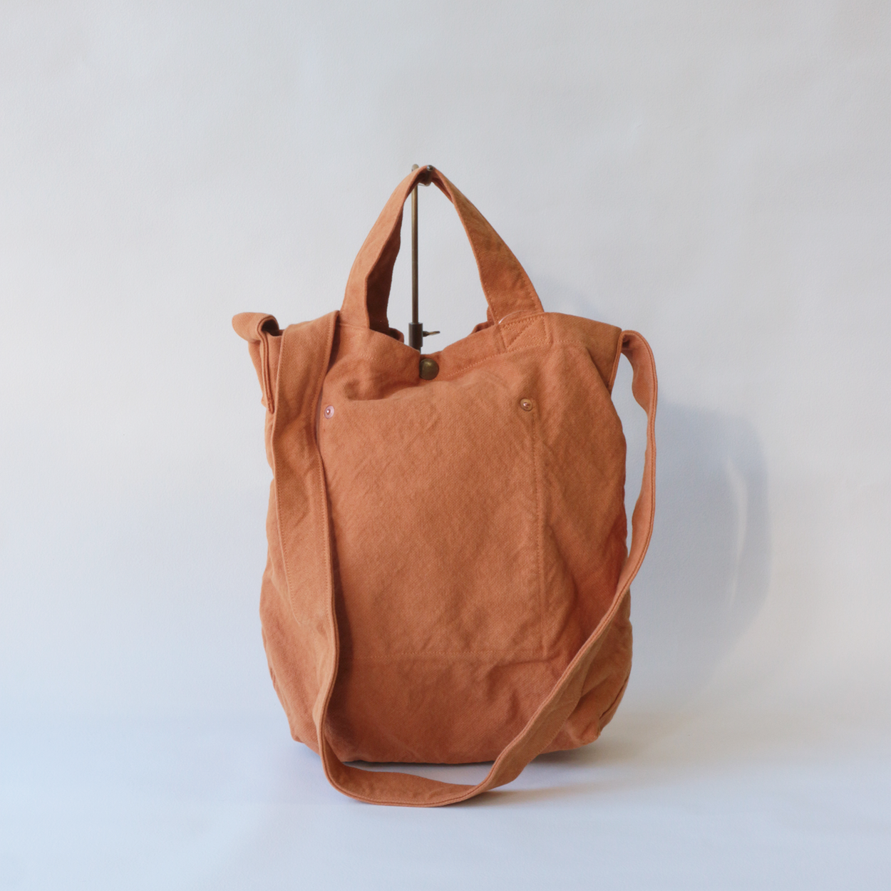 シンプルな形のトートバッグ。A4サイズが縦にぴったり入り、手提げでも肩がけでも使える二種類の持ち手がついています。日常使いに頼りになるカバンです。