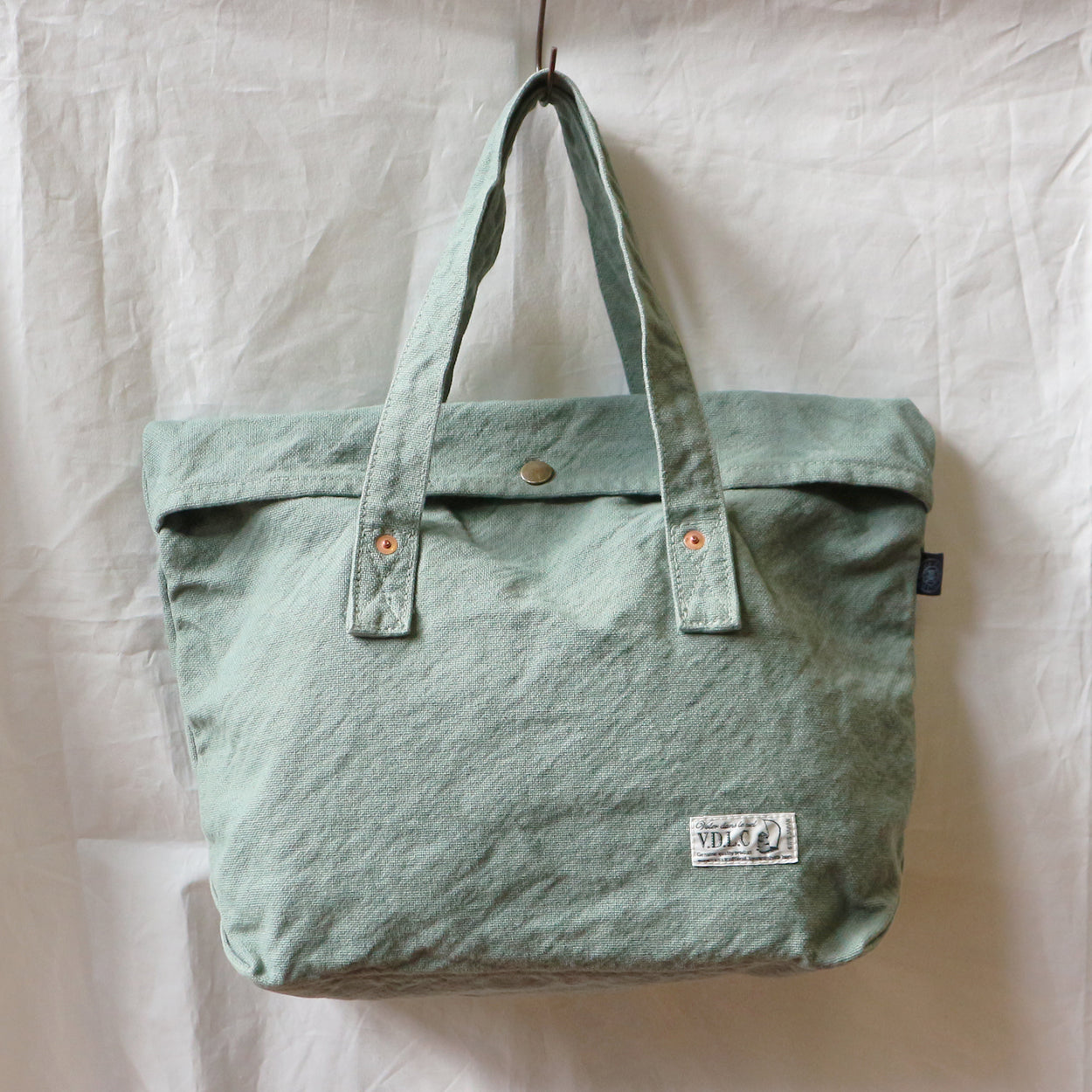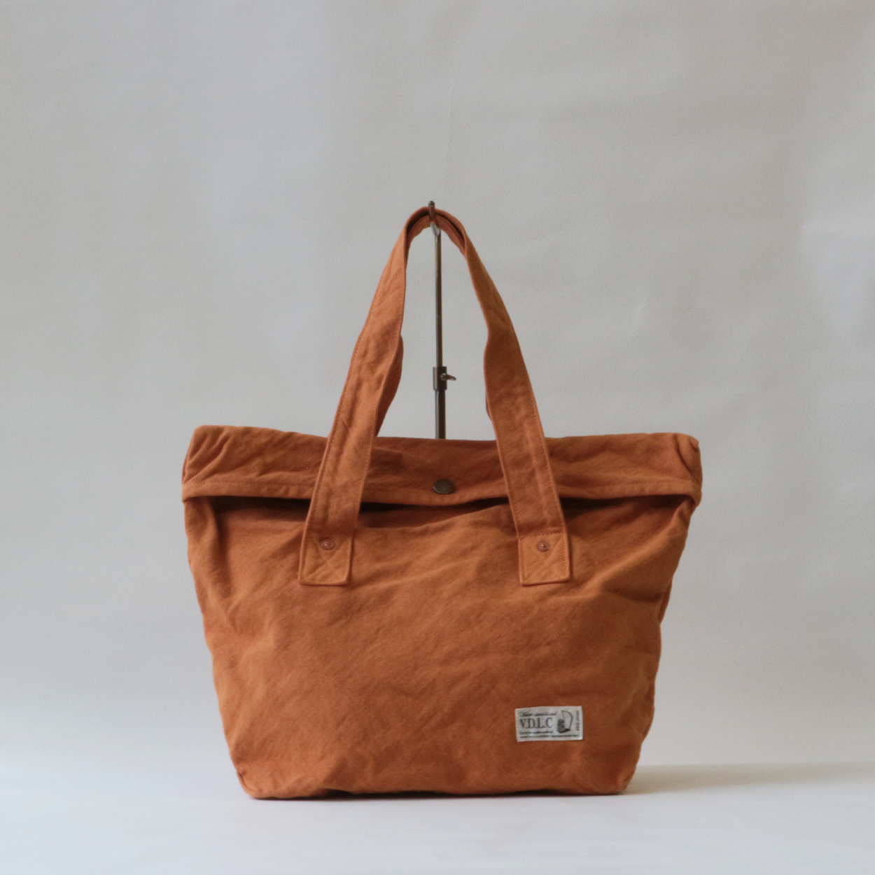 ミリタリーのヘルメットバッグに着想を得たバッグです。持ち手はジーンズ用のリベットで補強。ウォッシャブルの丈夫な手提げカバンで、ペットボトルは立てたまま入り、A4サイズもピッタリ入る使い勝手のいい形です。