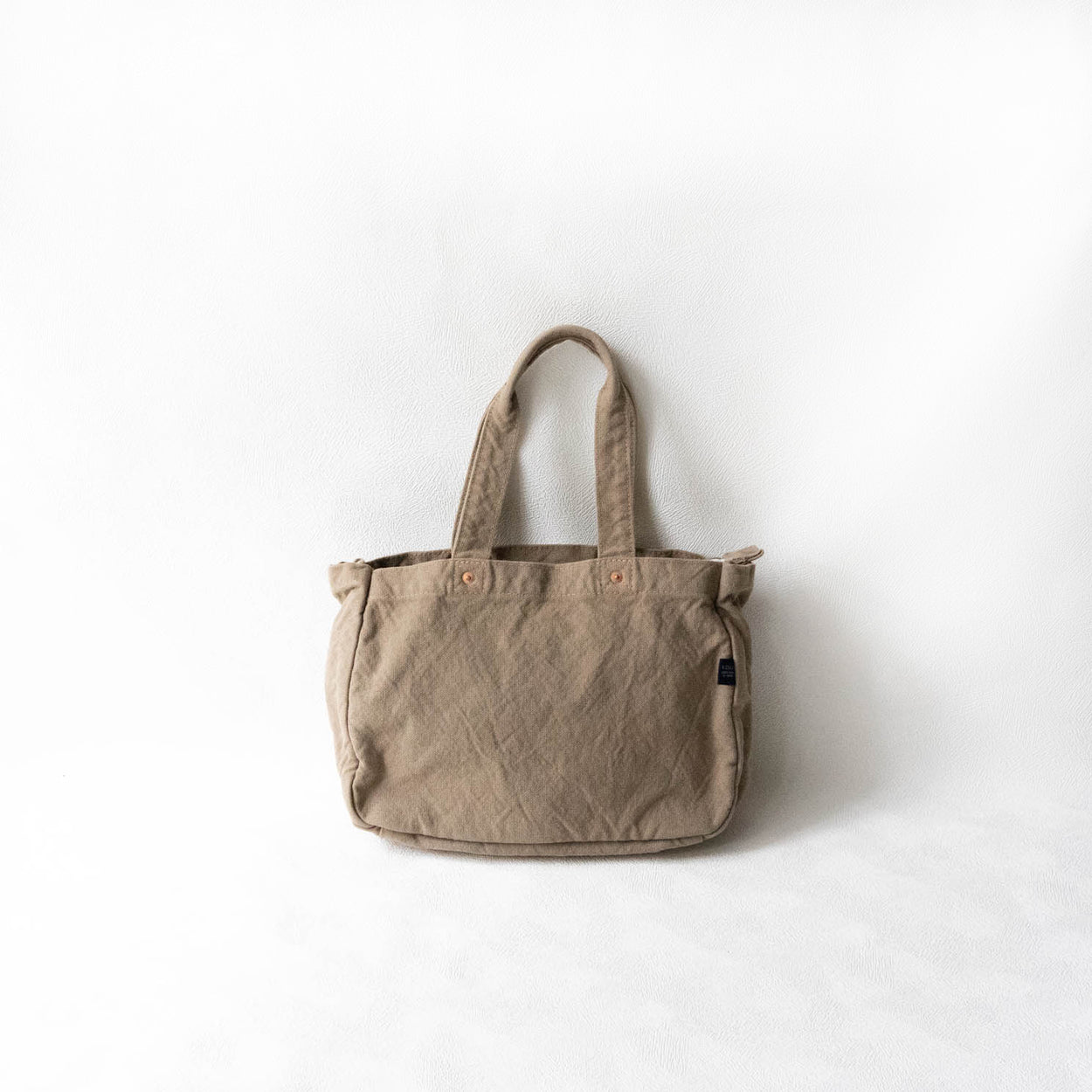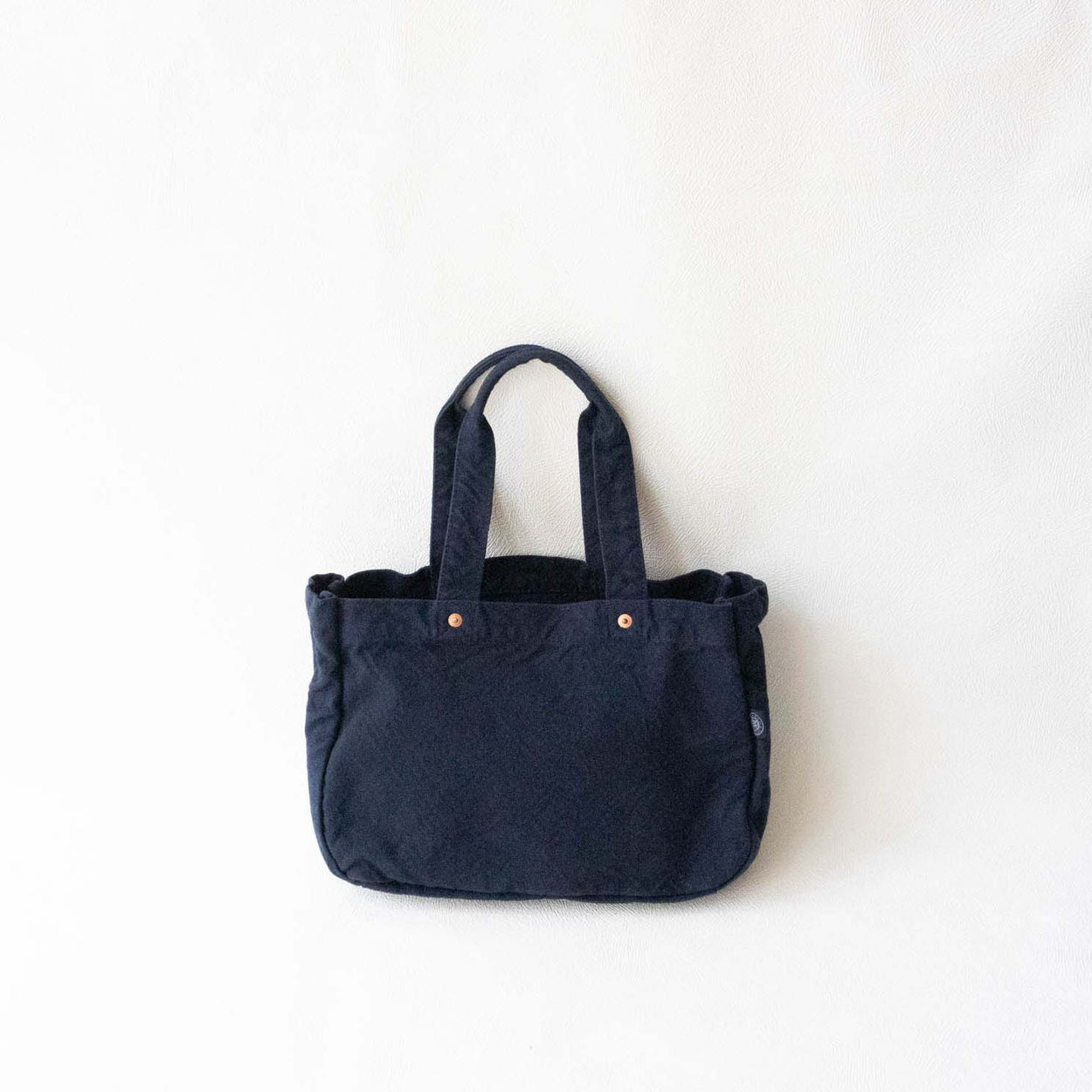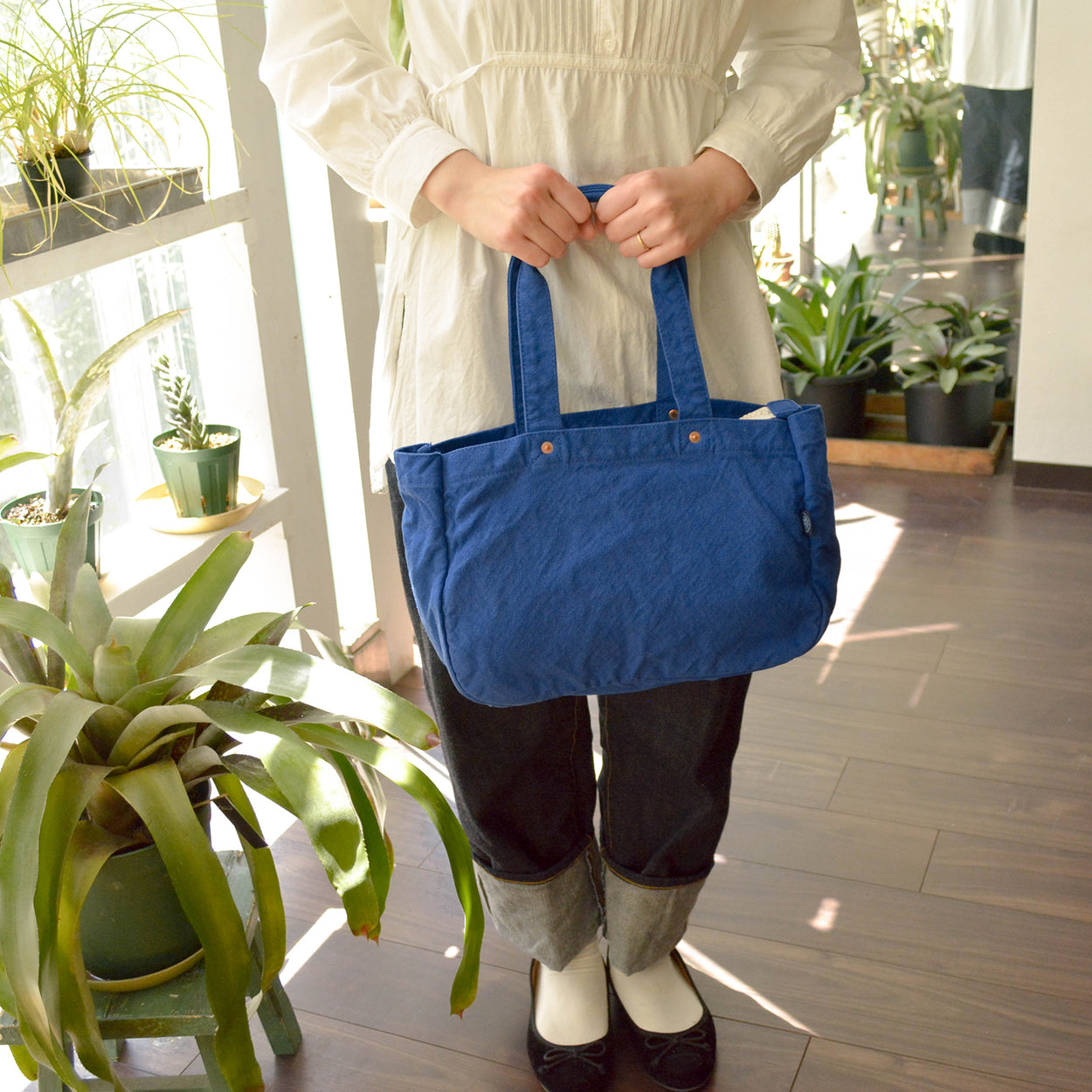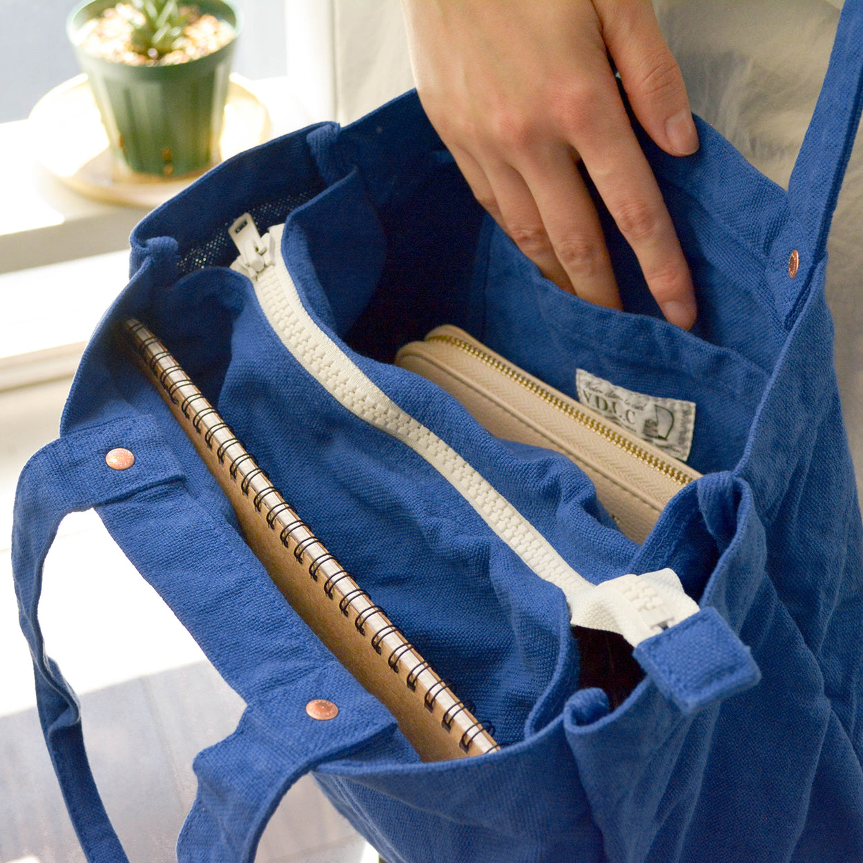 ---------サイズ --------- 横幅 30cm 深さ 23cm マチの幅 12cm 持ち手 幅 1.5cm(根元部分は 3cm) 長さ 42 内ポケット(一か所) 横幅 15cm 深さ 12cm ※サイズはおおよそですので染めによって多少のずれが生じます。 --------- 素材 --------- 綿100% --------- 重さ --------- 360g ※ 着用モデル身長 155cm 内側は仕切りで3つに分かれ、真ん中はファスナー付き。中をしっかり隠せます。 ジップの端を縫い留めているので、さっと開閉できます。内側に1つポケットあり。 マチが広いので、小さめシルエットの印象よりもはるかに容量があります。比較的カチッとした場面でも活躍できるシックな形のバッグです。 --------知っておいてほしい事--------