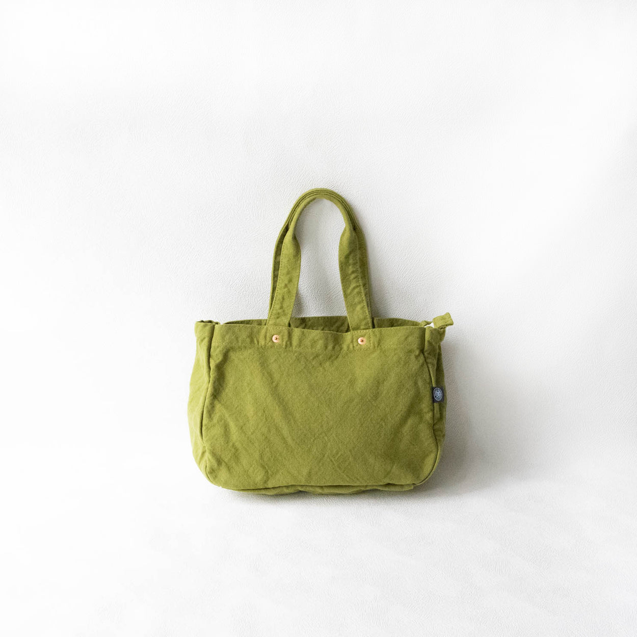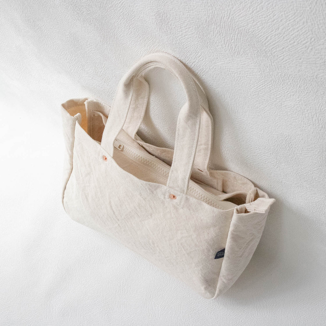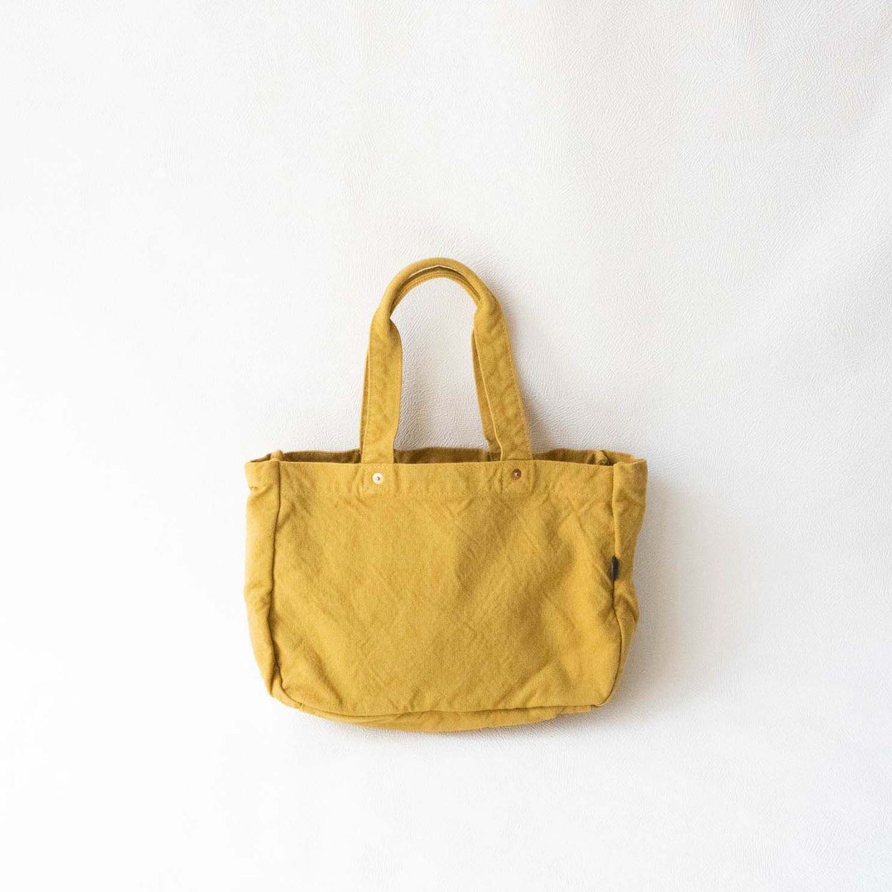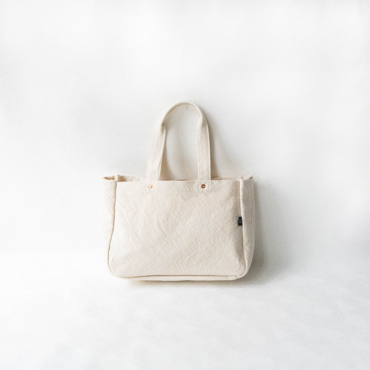 ---------サイズ --------- 横幅 30cm 深さ 23cm マチの幅 12cm 持ち手 幅 1.5cm(根元部分は 3cm) 長さ 42 内ポケット(一か所) 横幅 15cm 深さ 12cm ※サイズはおおよそですので染めによって多少のずれが生じます。 --------- 素材 --------- 綿100% --------- 重さ --------- 360g ※ 着用モデル身長 155cm 内側は仕切りで3つに分かれ、真ん中はファスナー付き。中をしっかり隠せます。 ジップの端を縫い留めているので、さっと開閉できます。内側に1つポケットあり。 マチが広いので、小さめシルエットの印象よりもはるかに容量があります。比較的カチッとした場面でも活躍できるシックな形のバッグです。 --------知っておいてほしい事--------