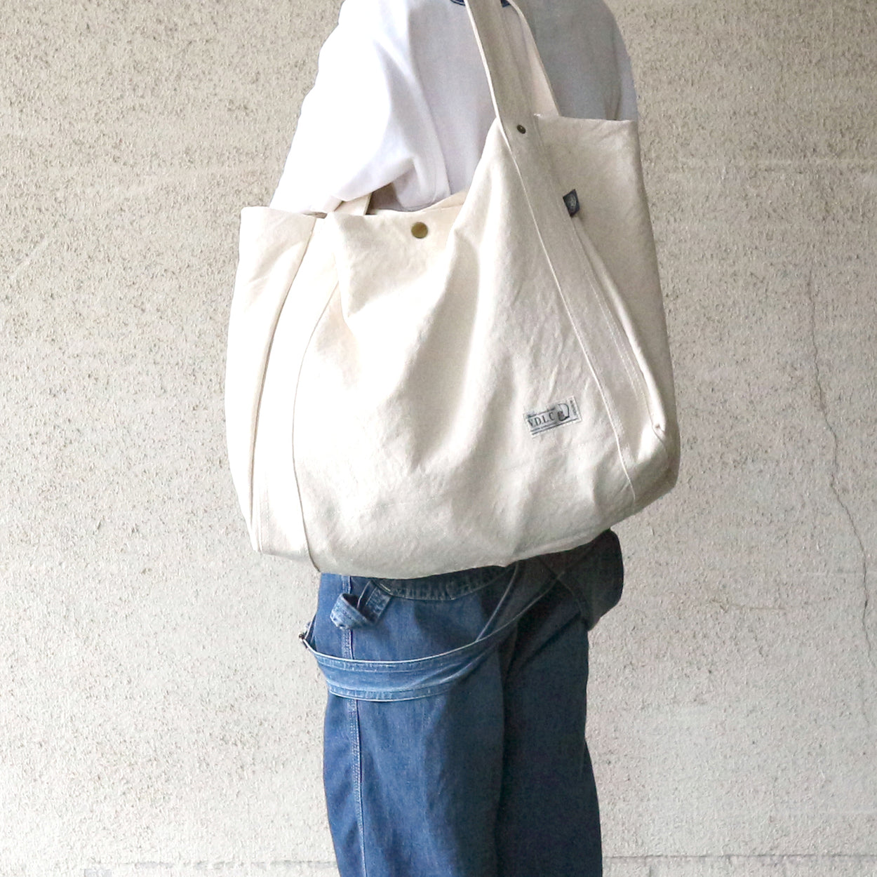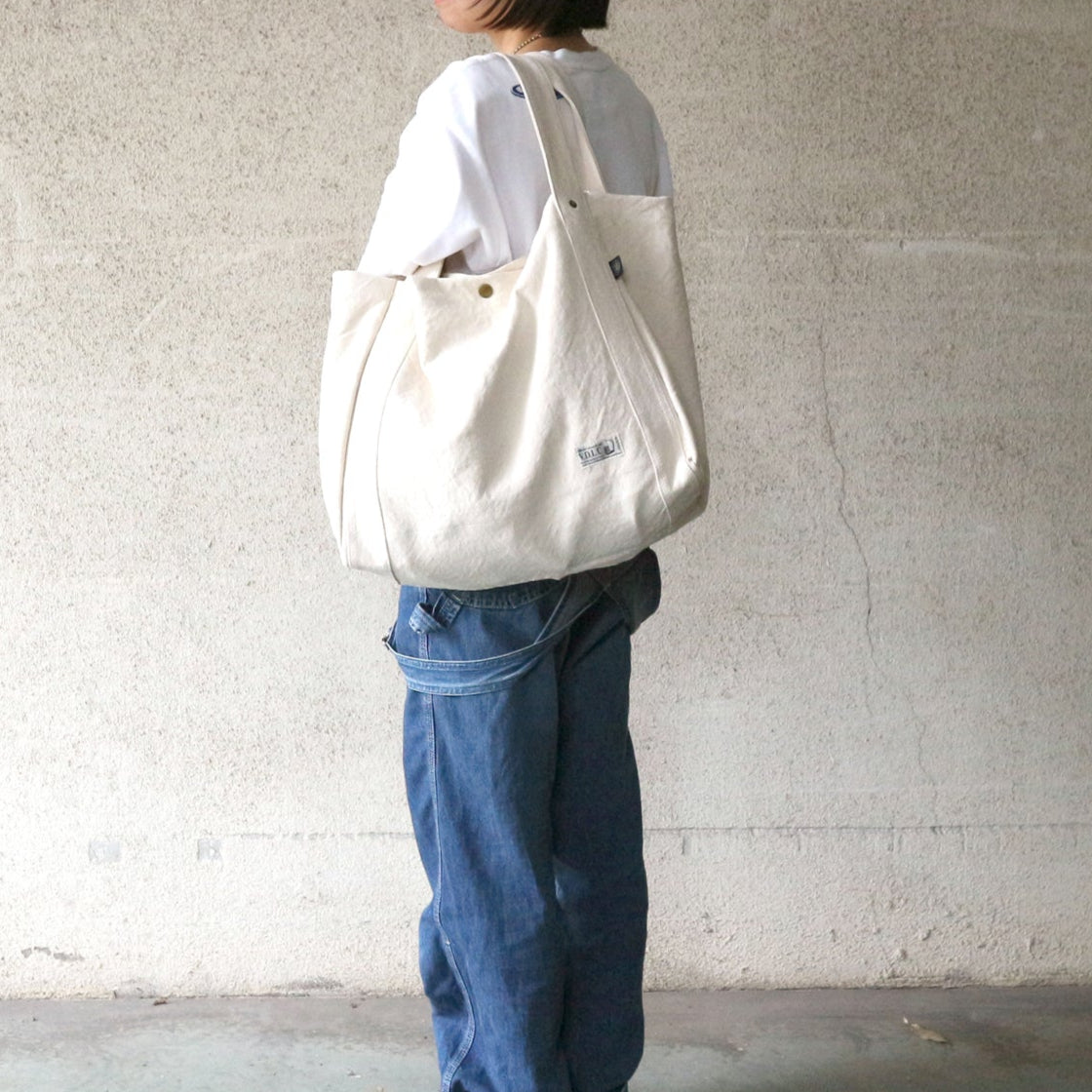 オーソドックスな形のトートバッグ。丸く縫い留めた持ち手は丈夫で手になじみます。口が広く荷物の出し入れがしやすく、マチもたっぷりでA4サイズも余裕で入ります。軽くて使いやすい大容量のショルダーバッグです。