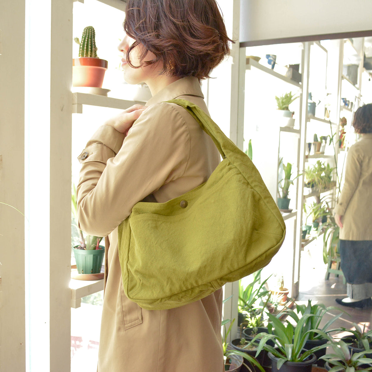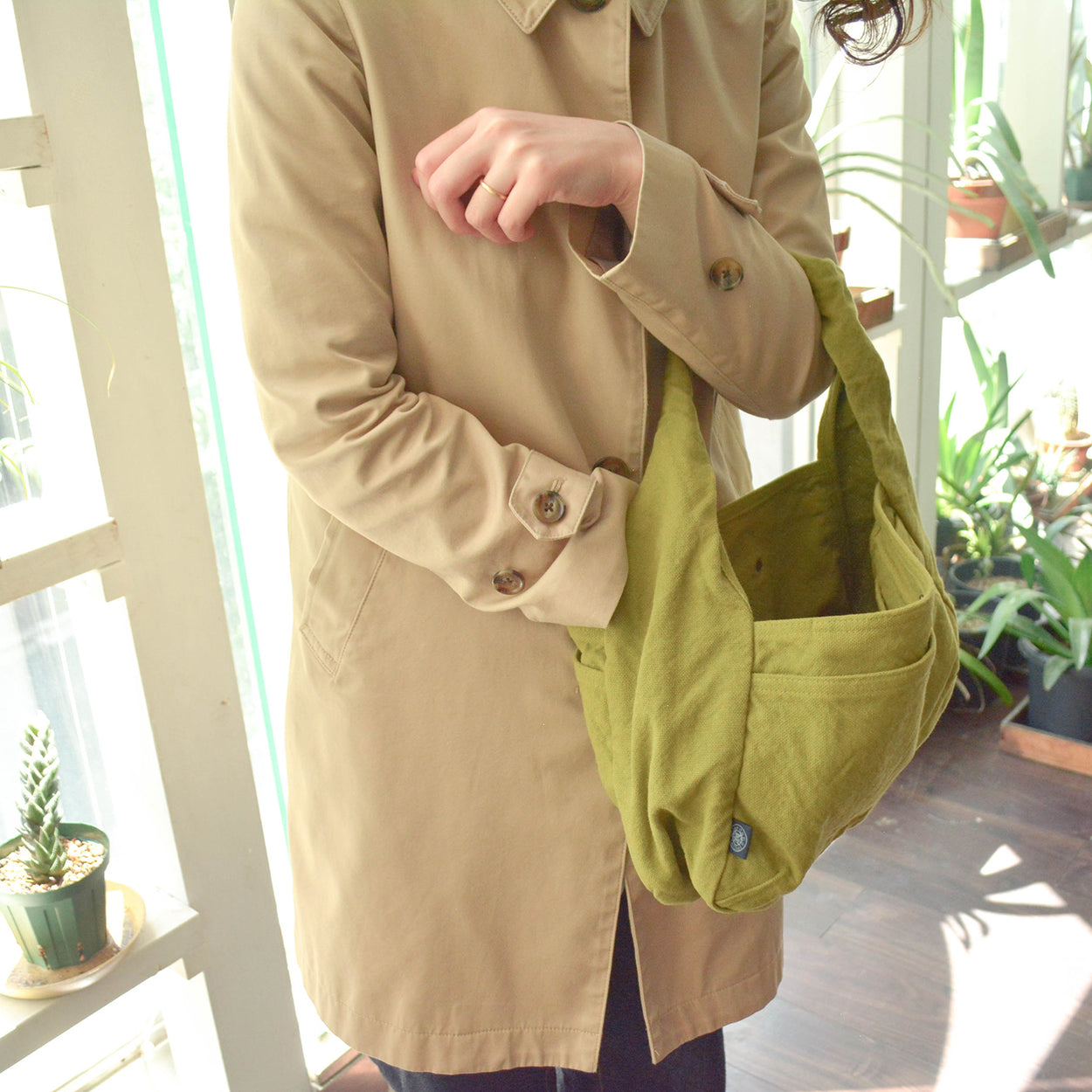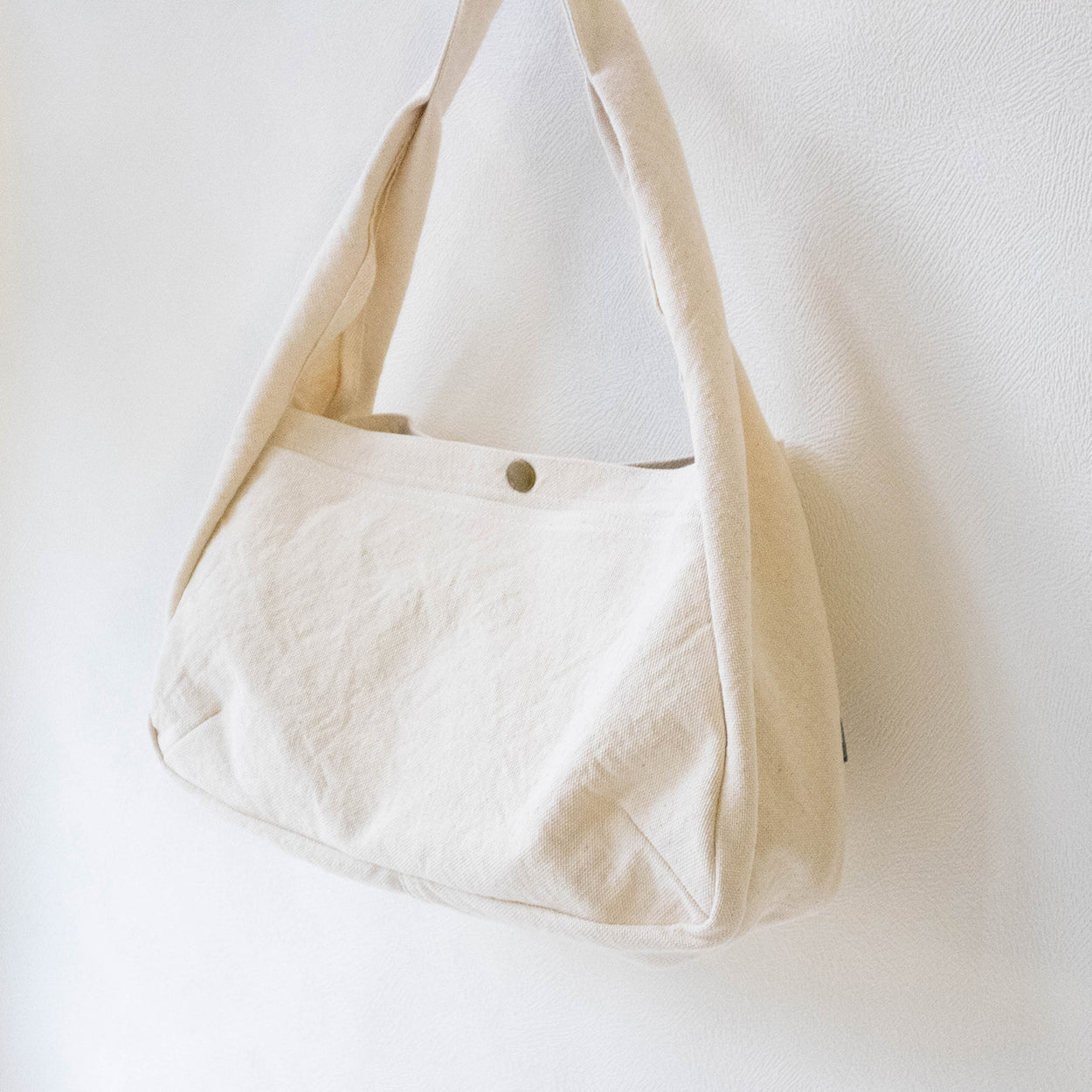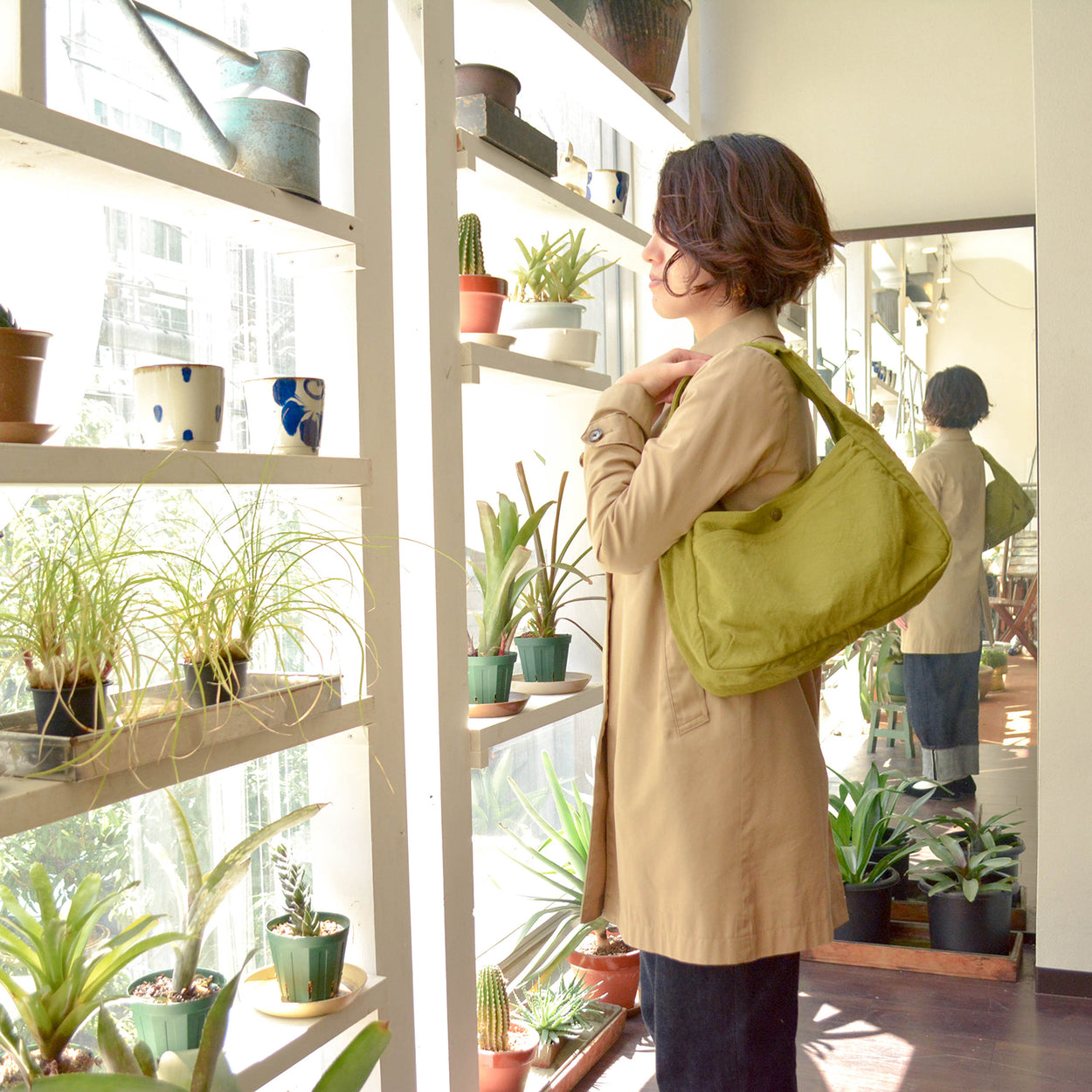 スナップボタンで閉じられる口と、側面の大きなポケットで機能的なうえに、カジュアル過ぎない上品なショルダーバッグ。バッグのマチから続くショルダー紐を持つと、ゆるい三角形に見える、優しい印象のカバンです。