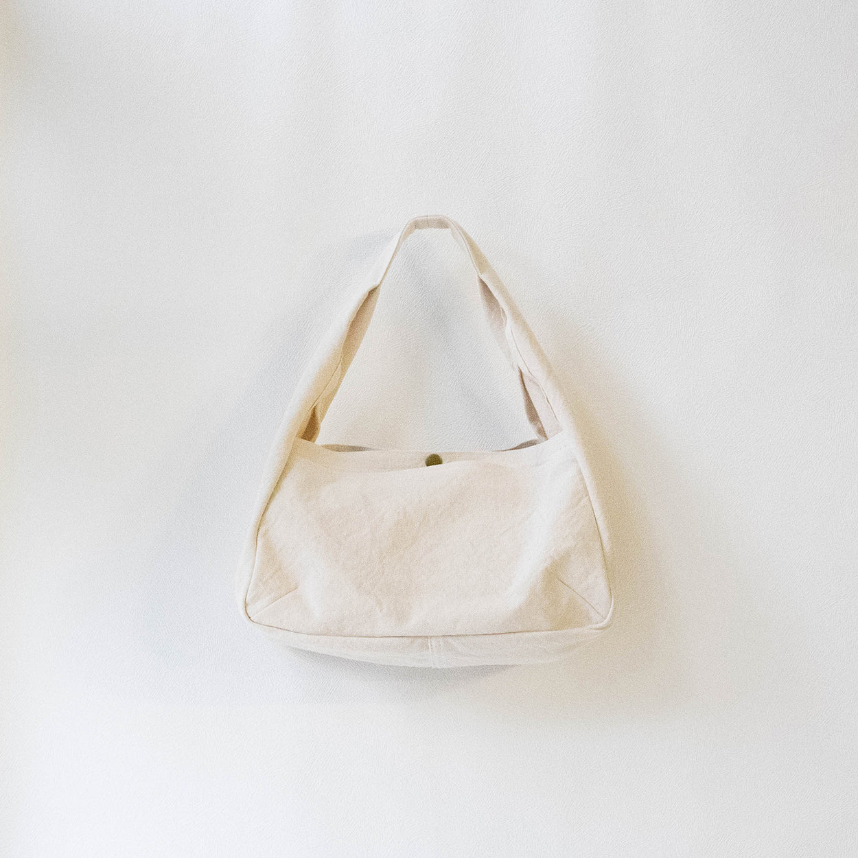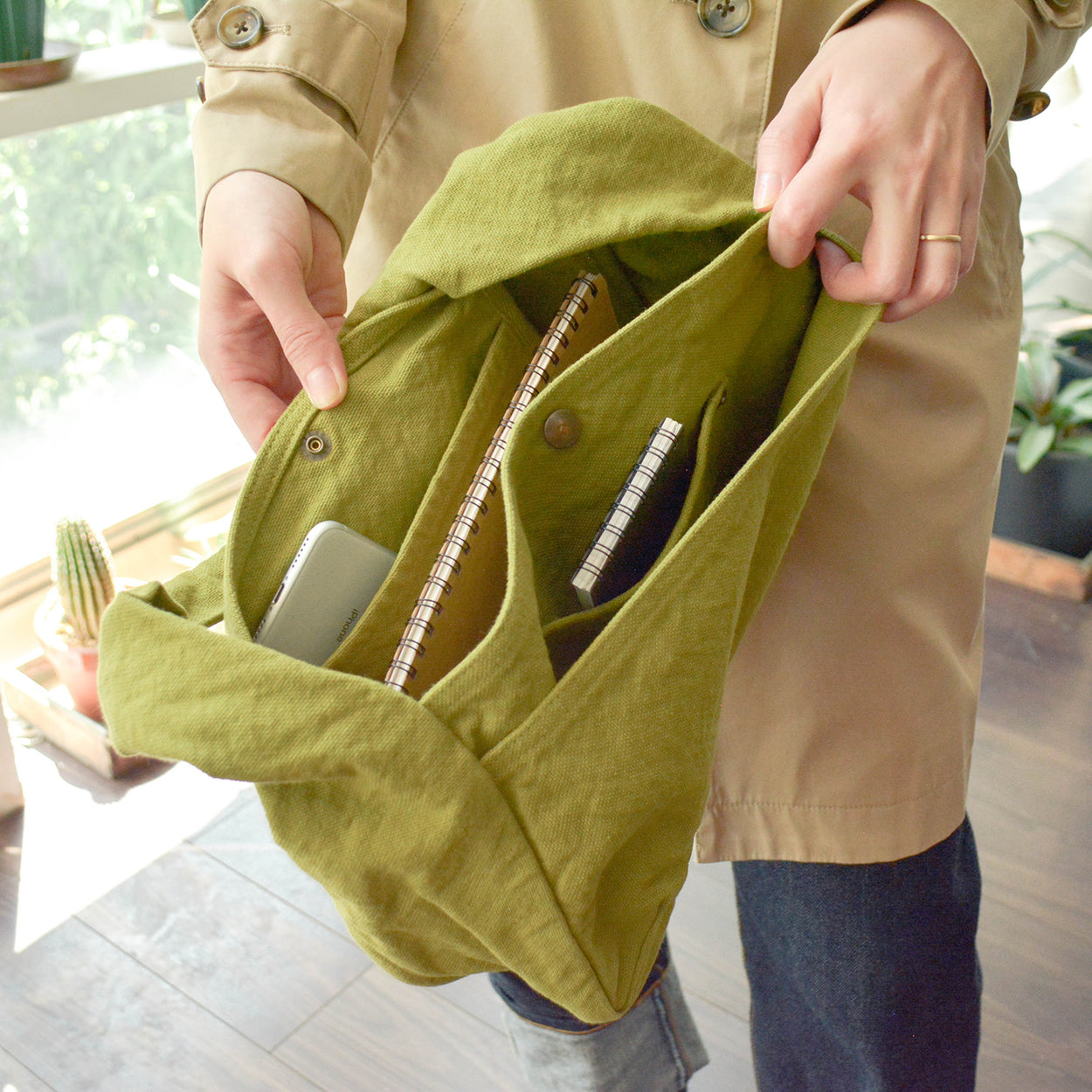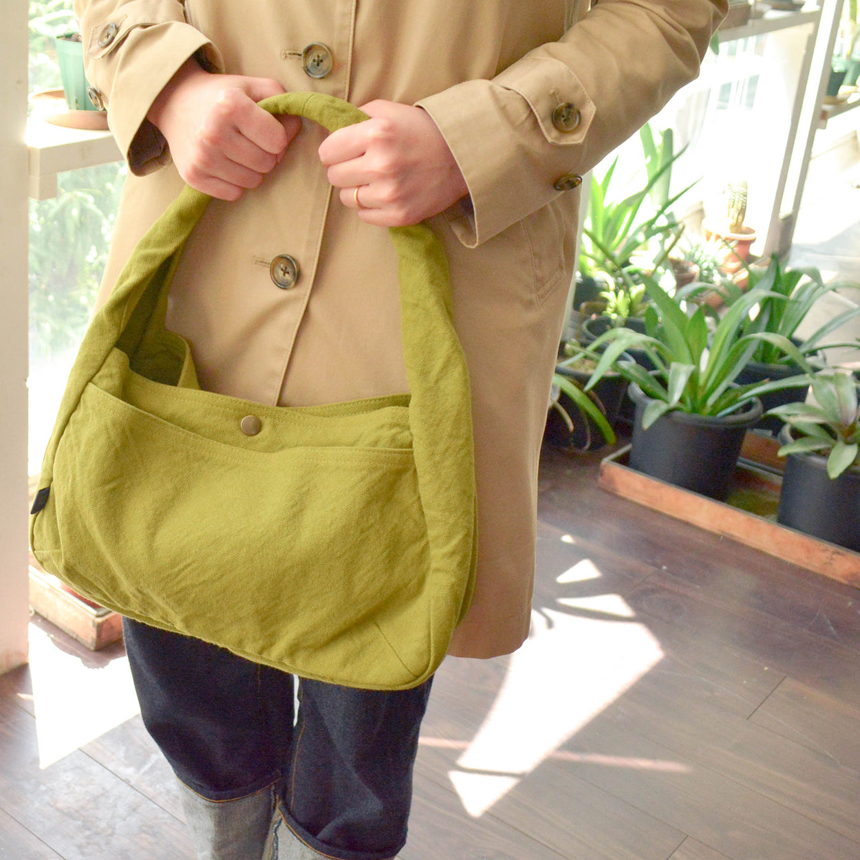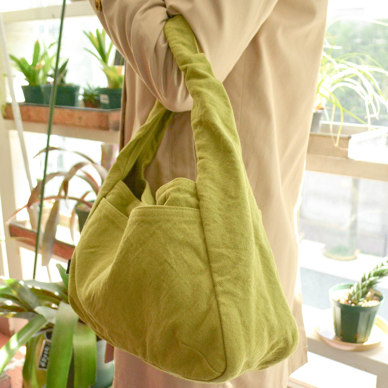 スナップボタンで閉じられる口と、側面の大きなポケットで機能的なうえに、カジュアル過ぎない上品なショルダーバッグ。バッグのマチから続くショルダー紐を持つと、ゆるい三角形に見える、優しい印象のカバンです。