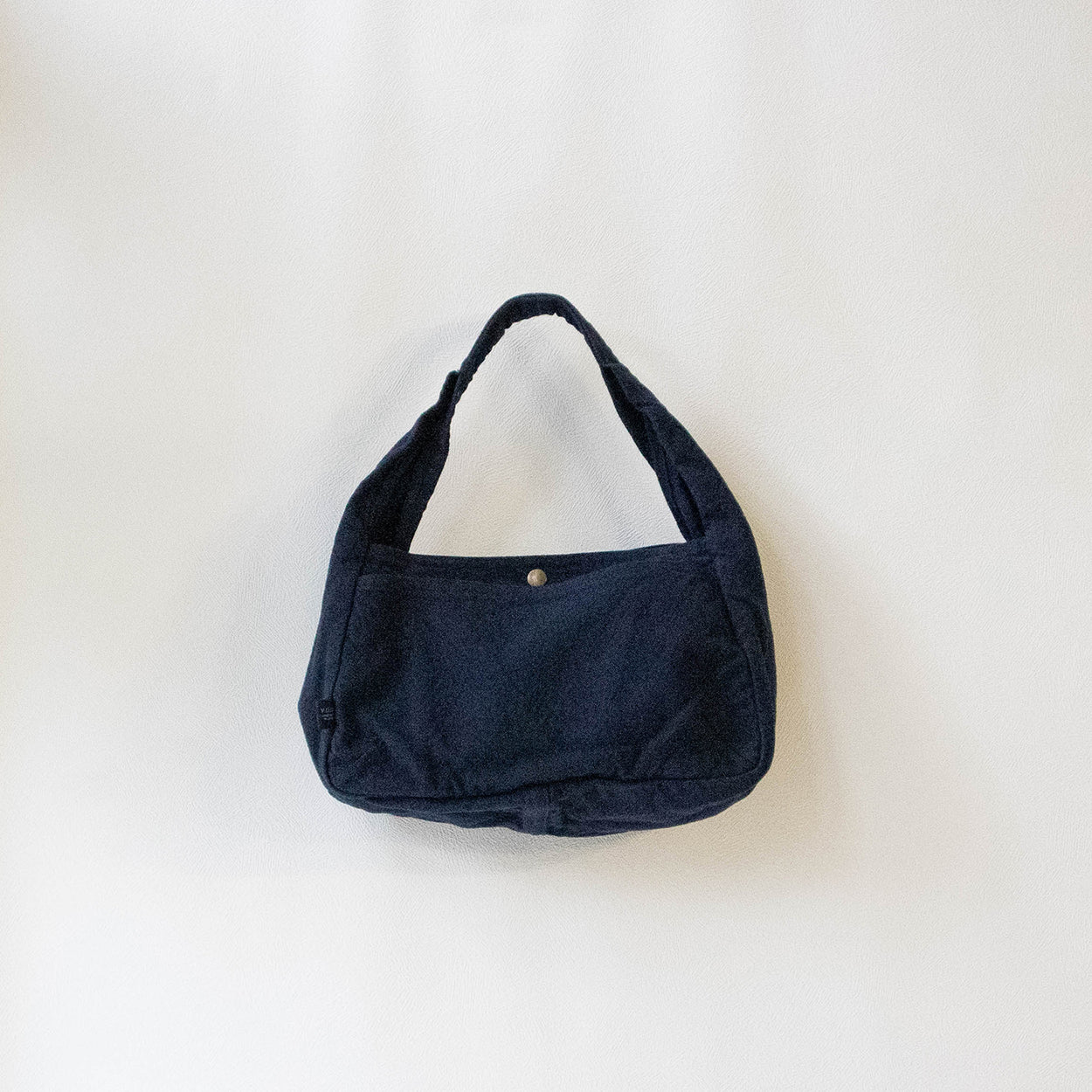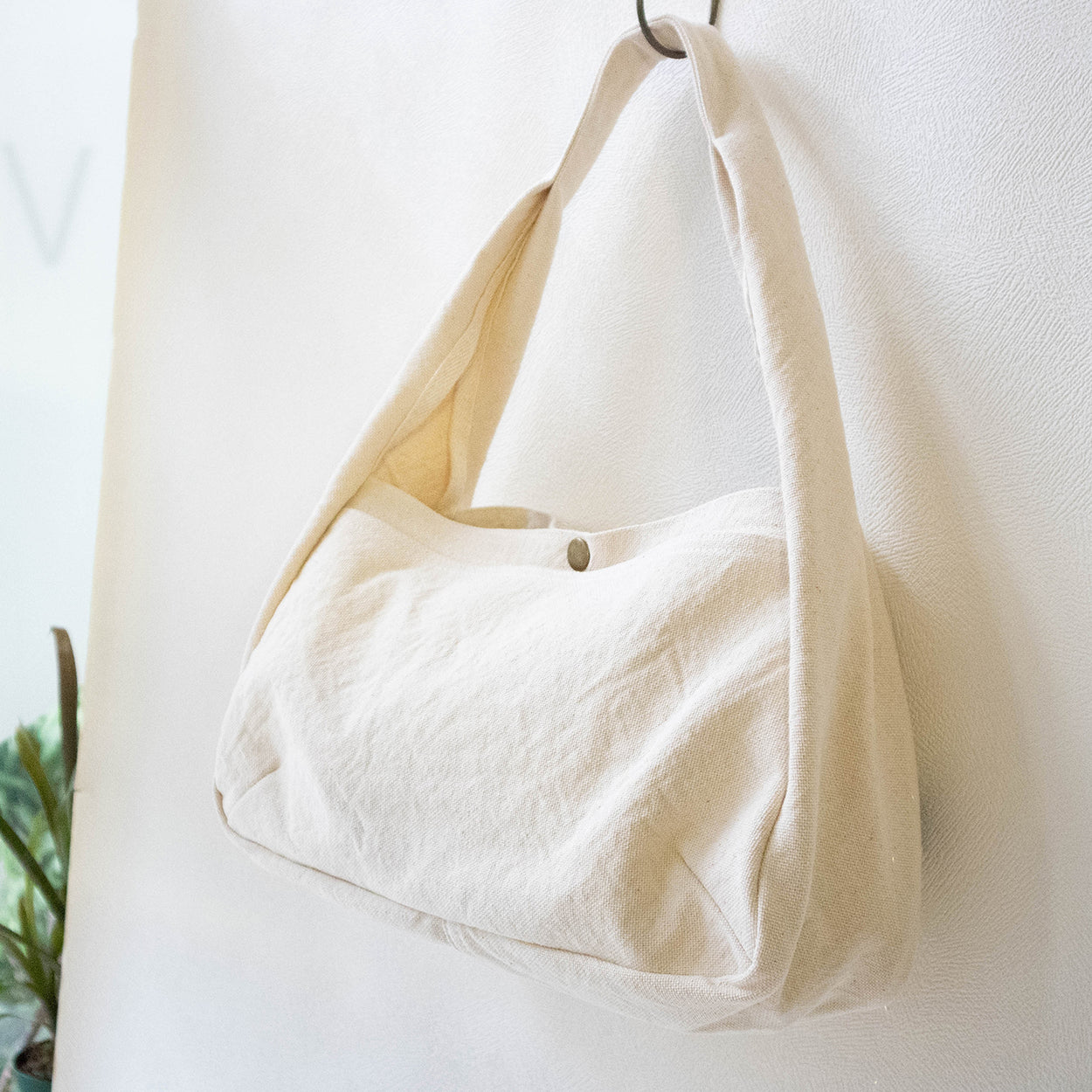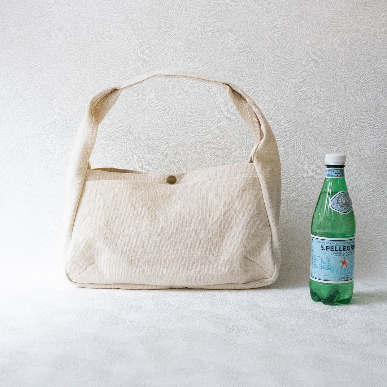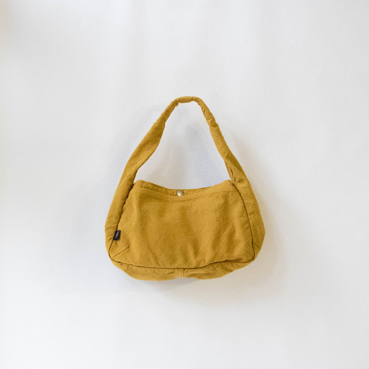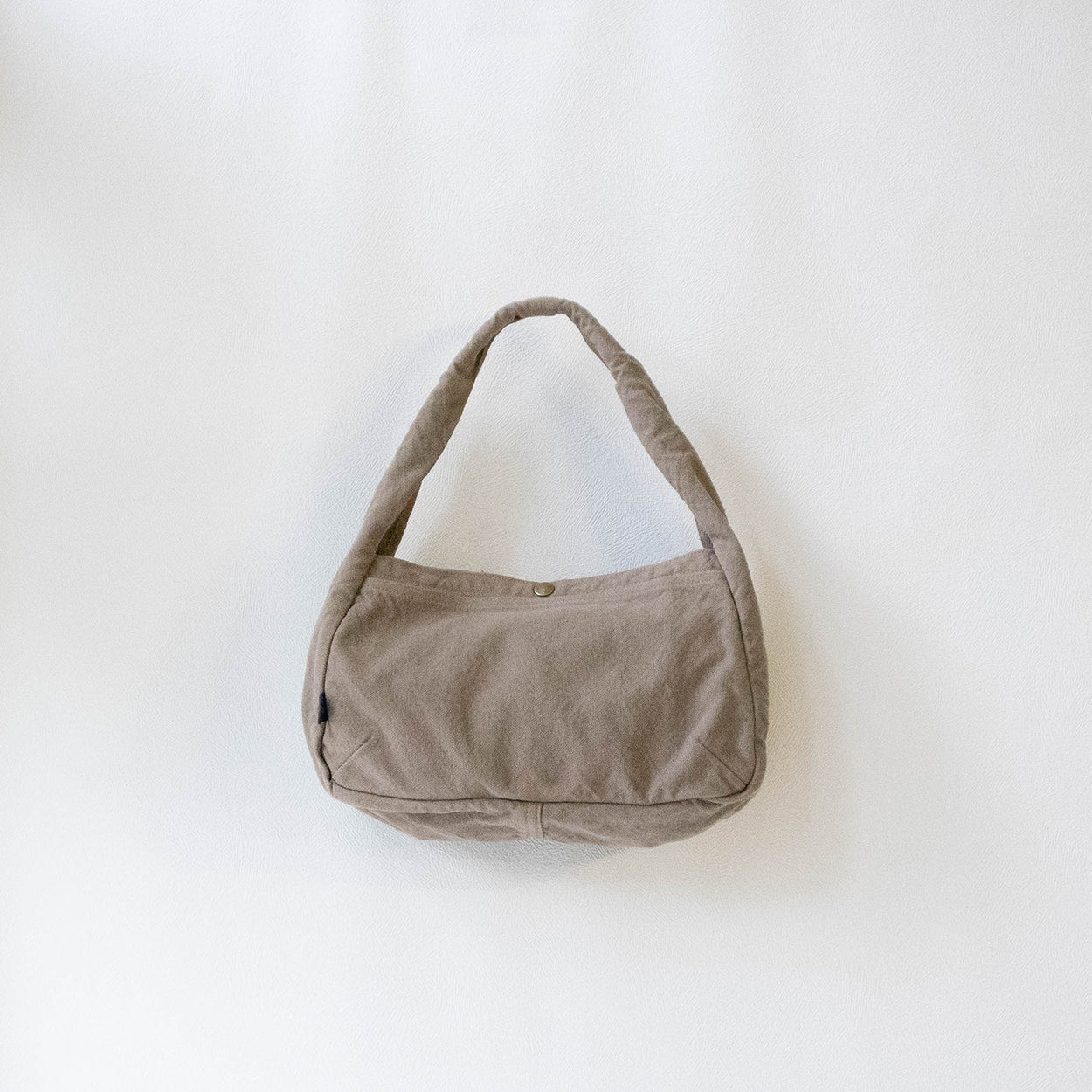 スナップボタンで閉じられる口と、側面の大きなポケットで機能的なうえに、カジュアル過ぎない上品なショルダーバッグ。バッグのマチから続くショルダー紐を持つと、ゆるい三角形に見える、優しい印象のカバンです。