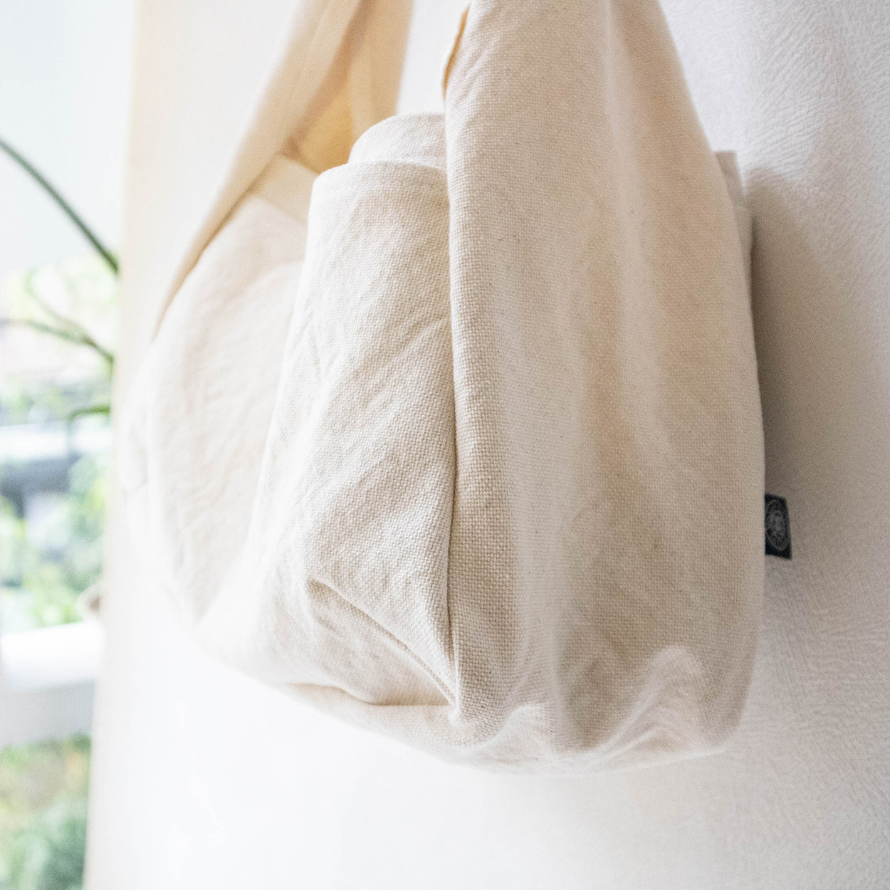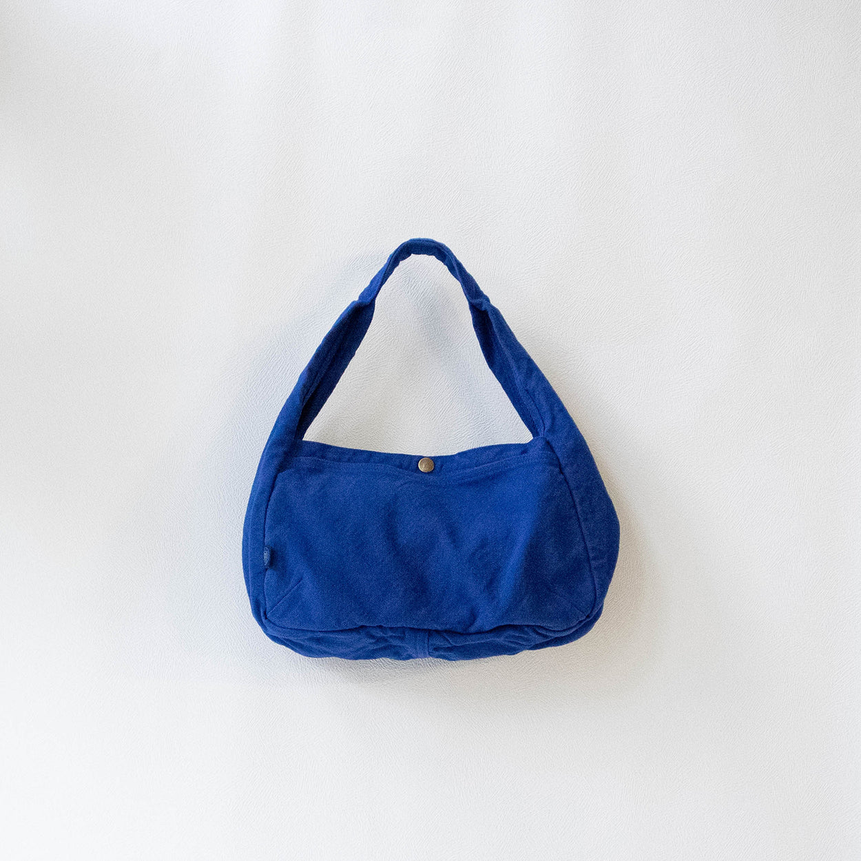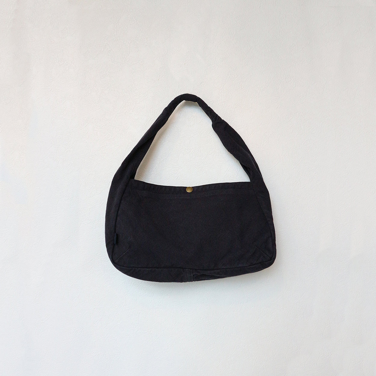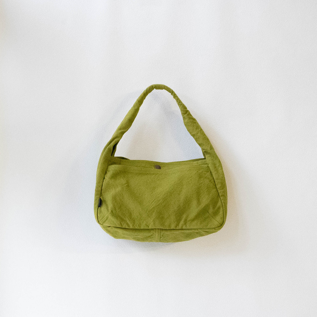 スナップボタンで閉じられる口と、側面の大きなポケットで機能的なうえに、カジュアル過ぎない上品なショルダーバッグ。バッグのマチから続くショルダー紐を持つと、ゆるい三角形に見える、優しい印象のカバンです。
