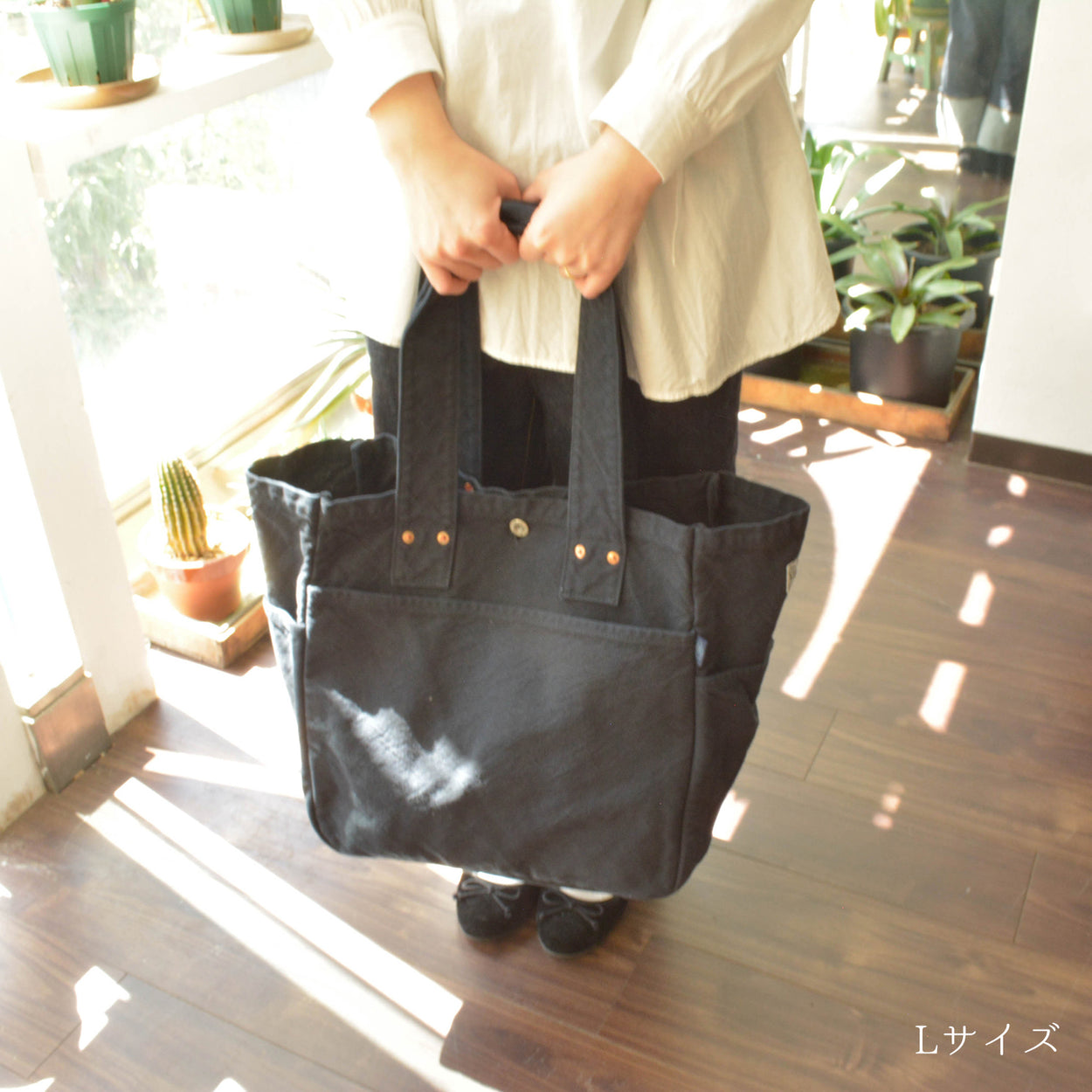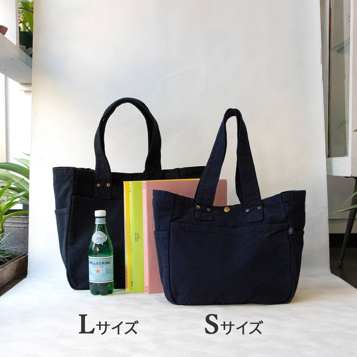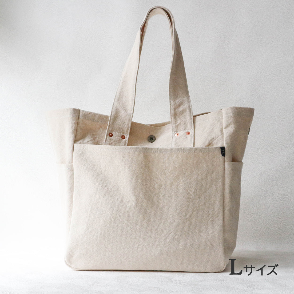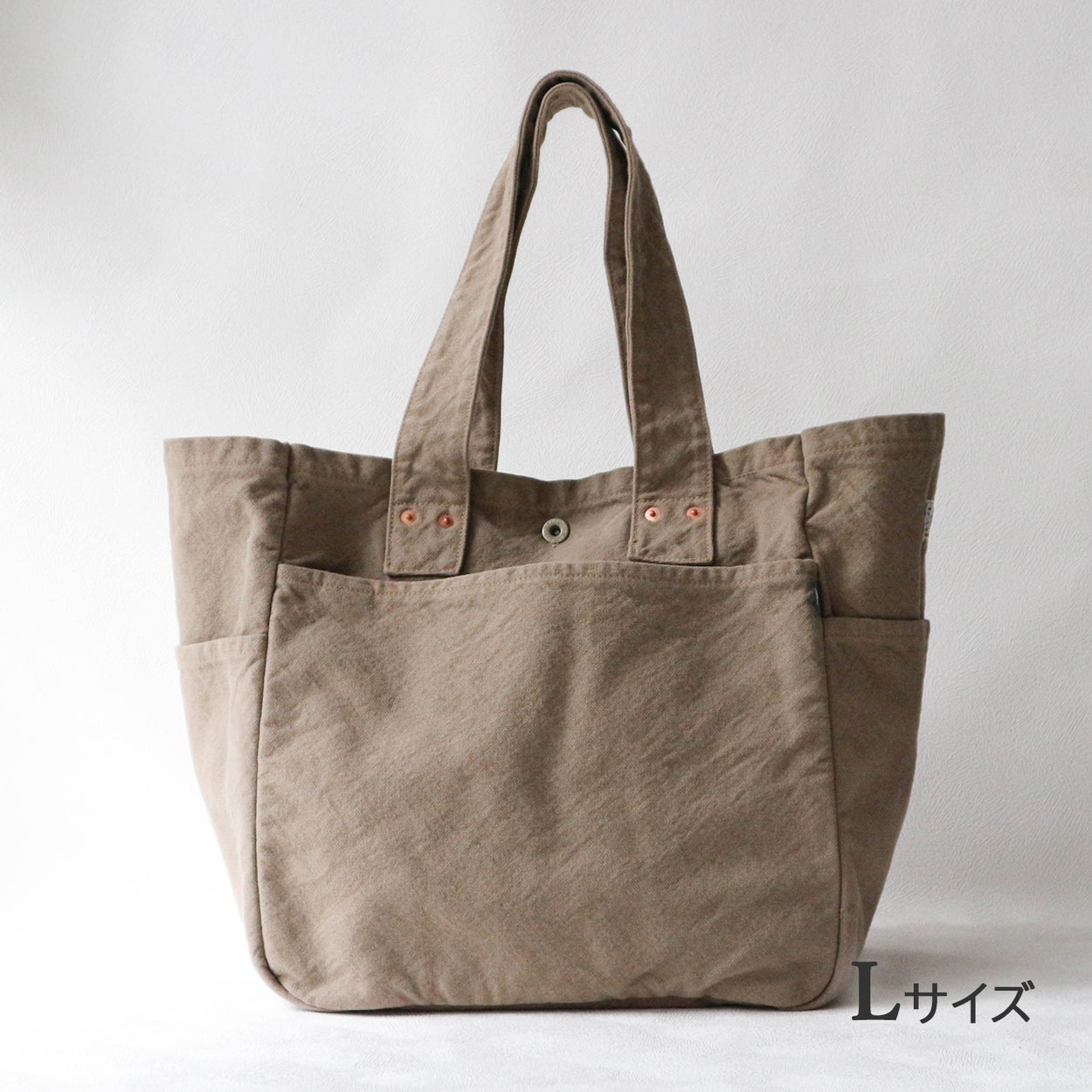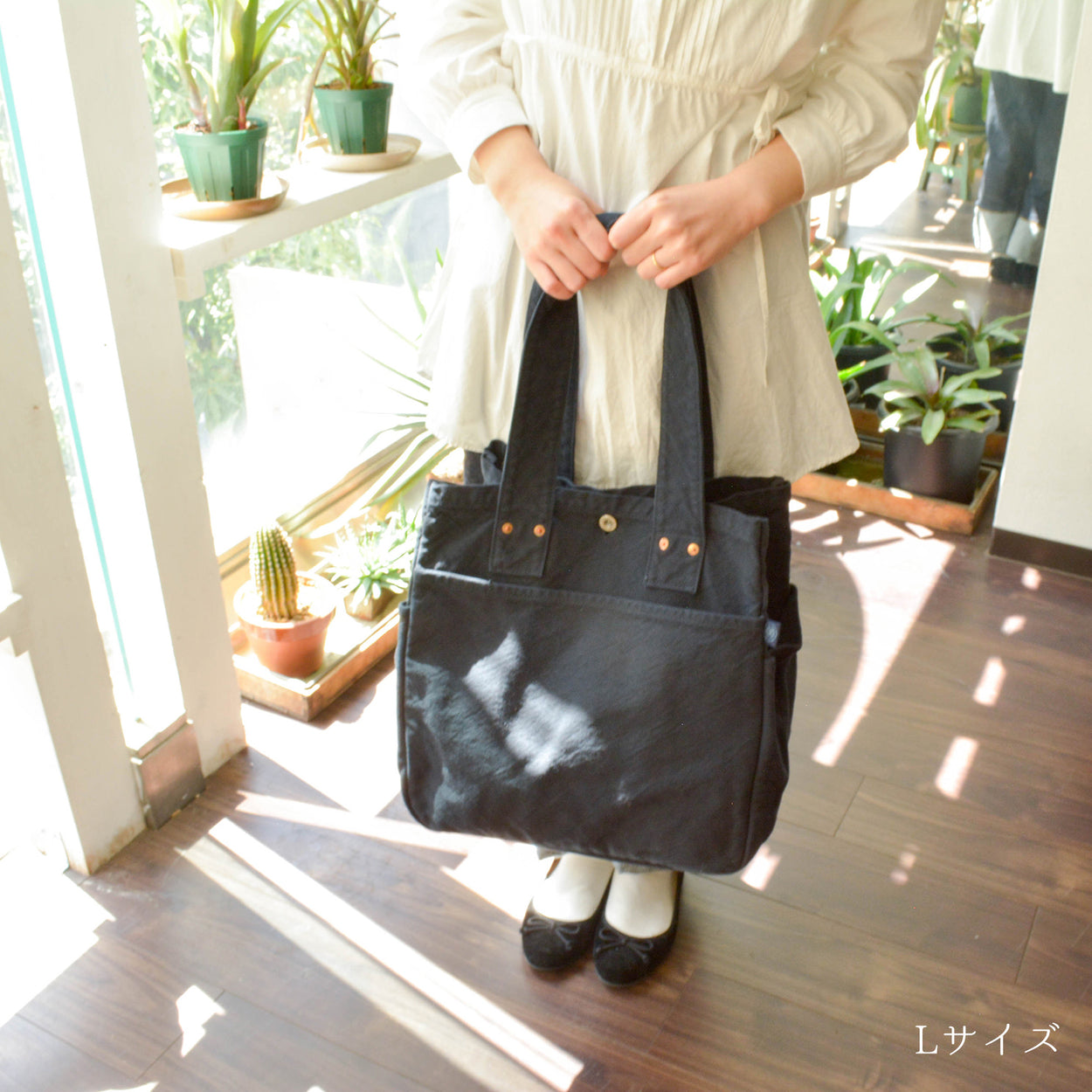 口が広く、大きなマチの大容量トートバッグ。 サイズ展開はS・Lの2種類。 カバン自体が軽く持ち手も十分な幅があり、痛くなりにくい工夫があります。外側に4つのポケットが付き。荷物の整理に活用して下さい。 Sサイズはスナップボタン、Lサイズはドーナツボタンを使用しています。