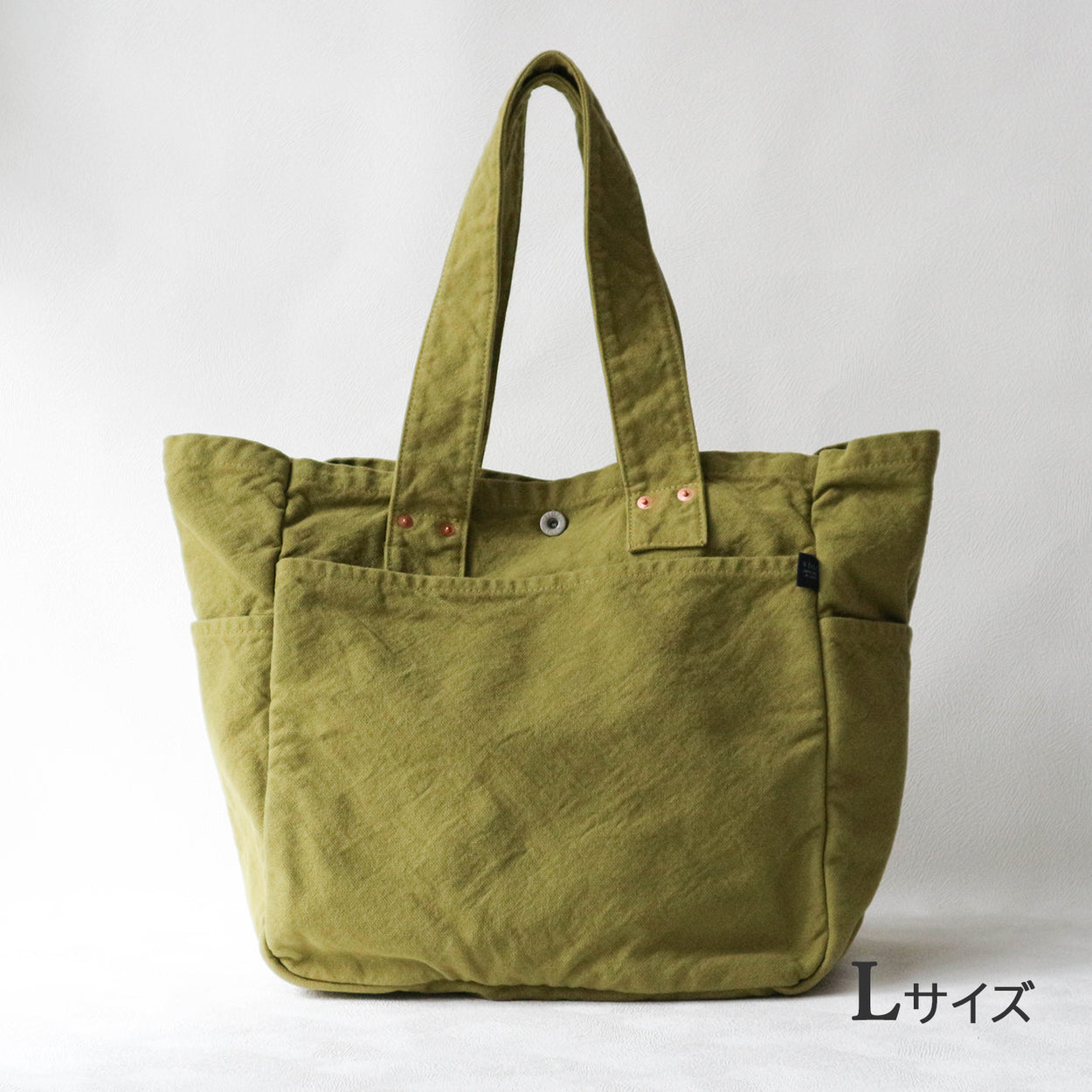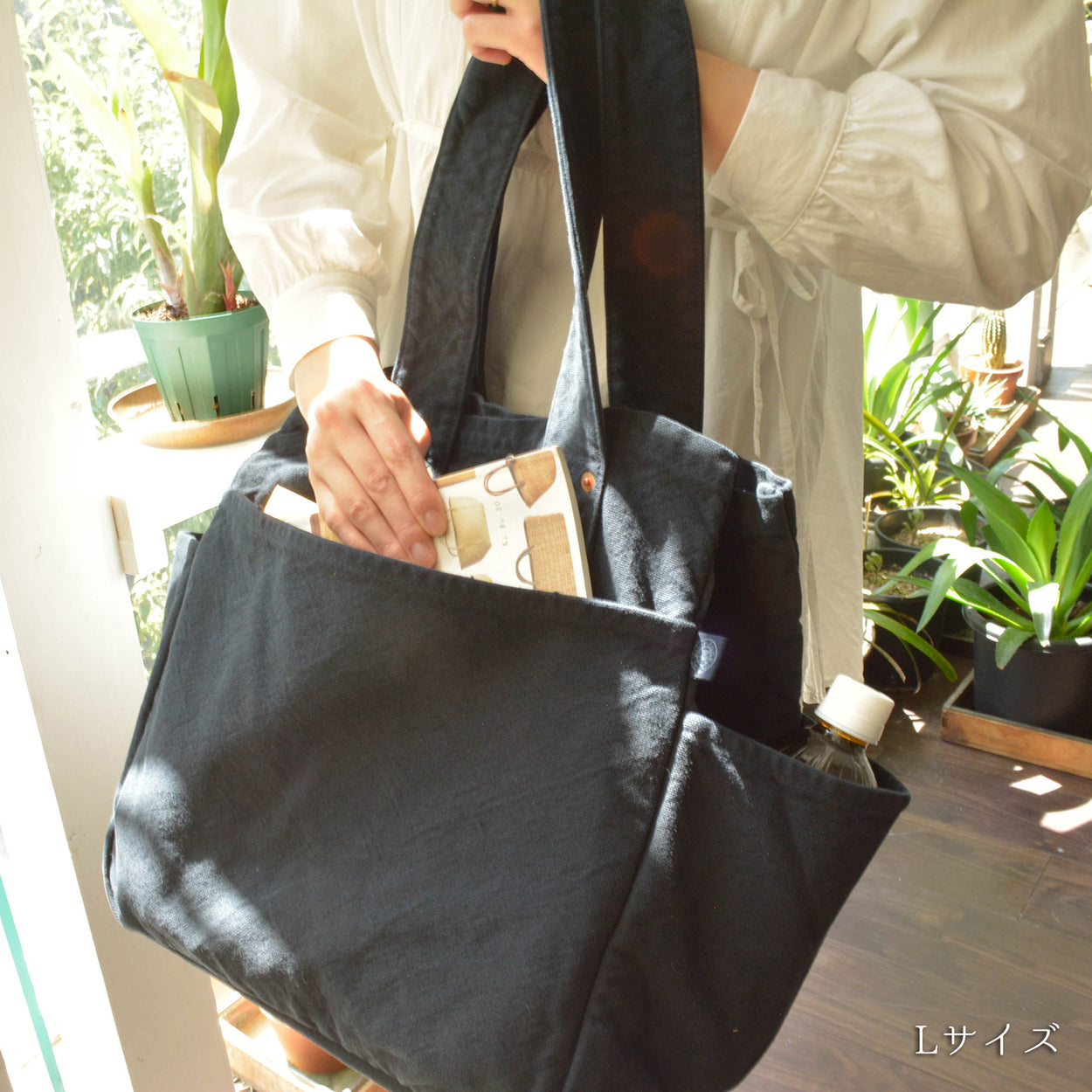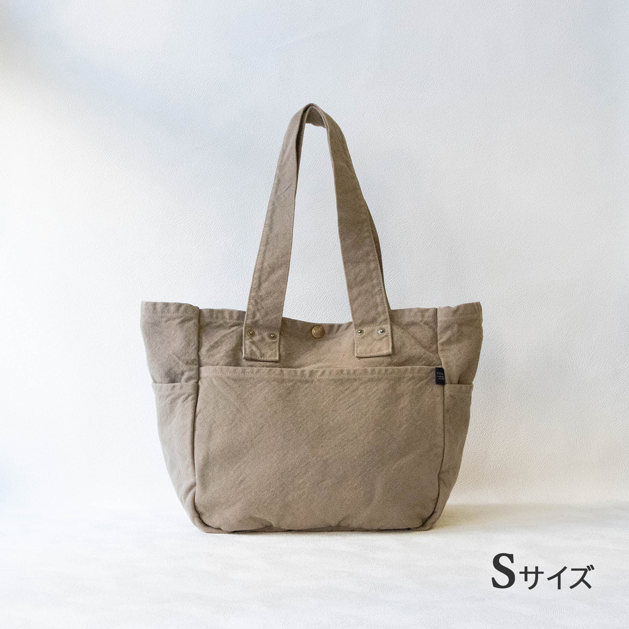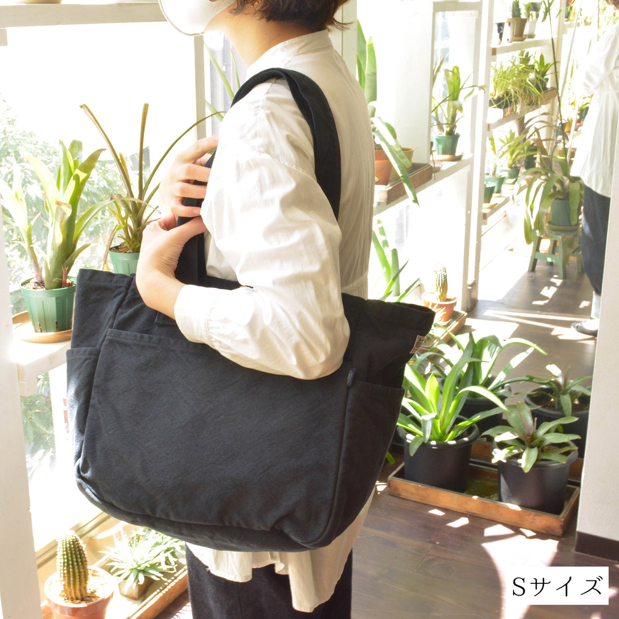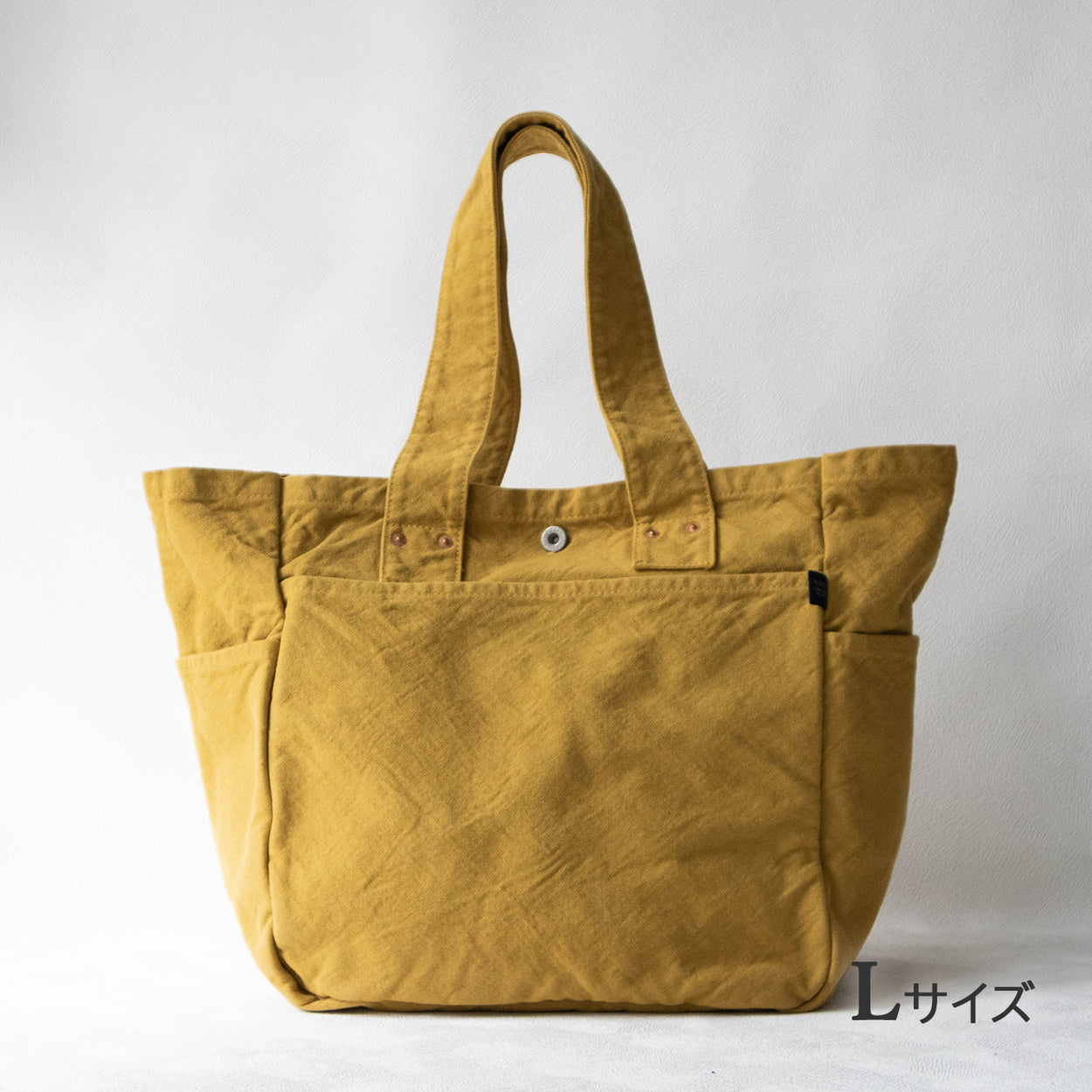 口が広く、大きなマチの大容量トートバッグ。 サイズ展開はS・Lの2種類。 カバン自体が軽く持ち手も十分な幅があり、痛くなりにくい工夫があります。外側に4つのポケットが付き。荷物の整理に活用して下さい。 Sサイズはスナップボタン、Lサイズはドーナツボタンを使用しています。
