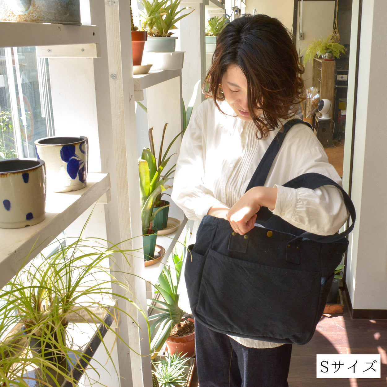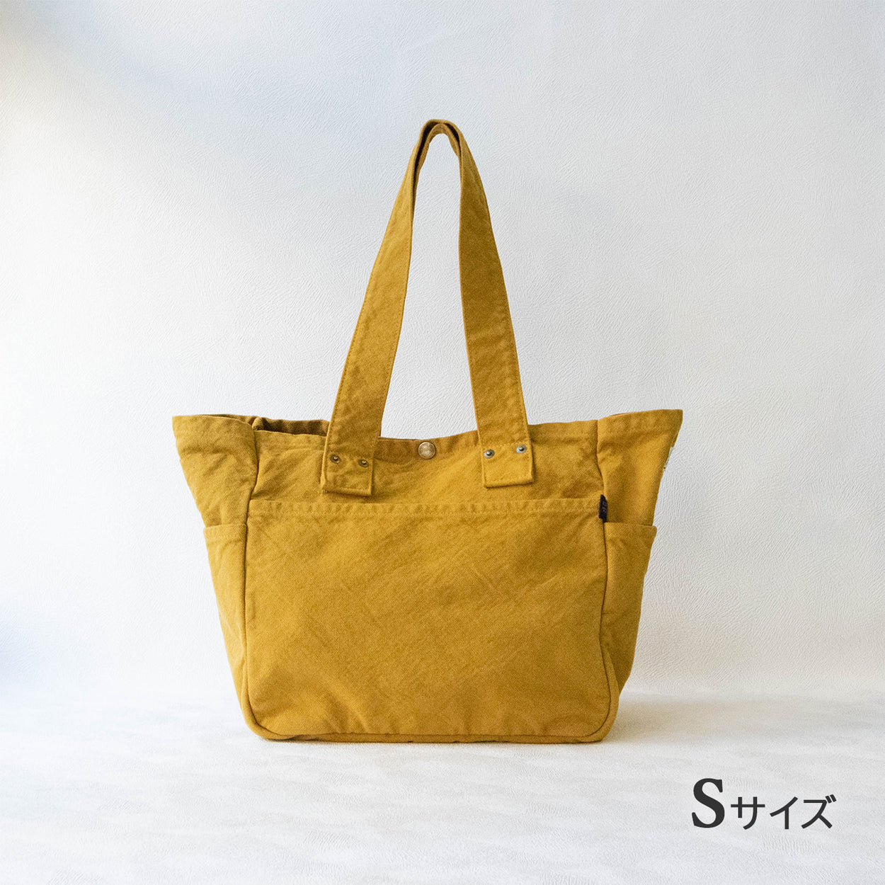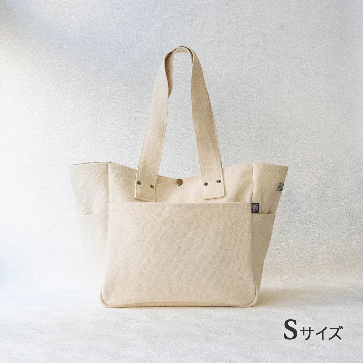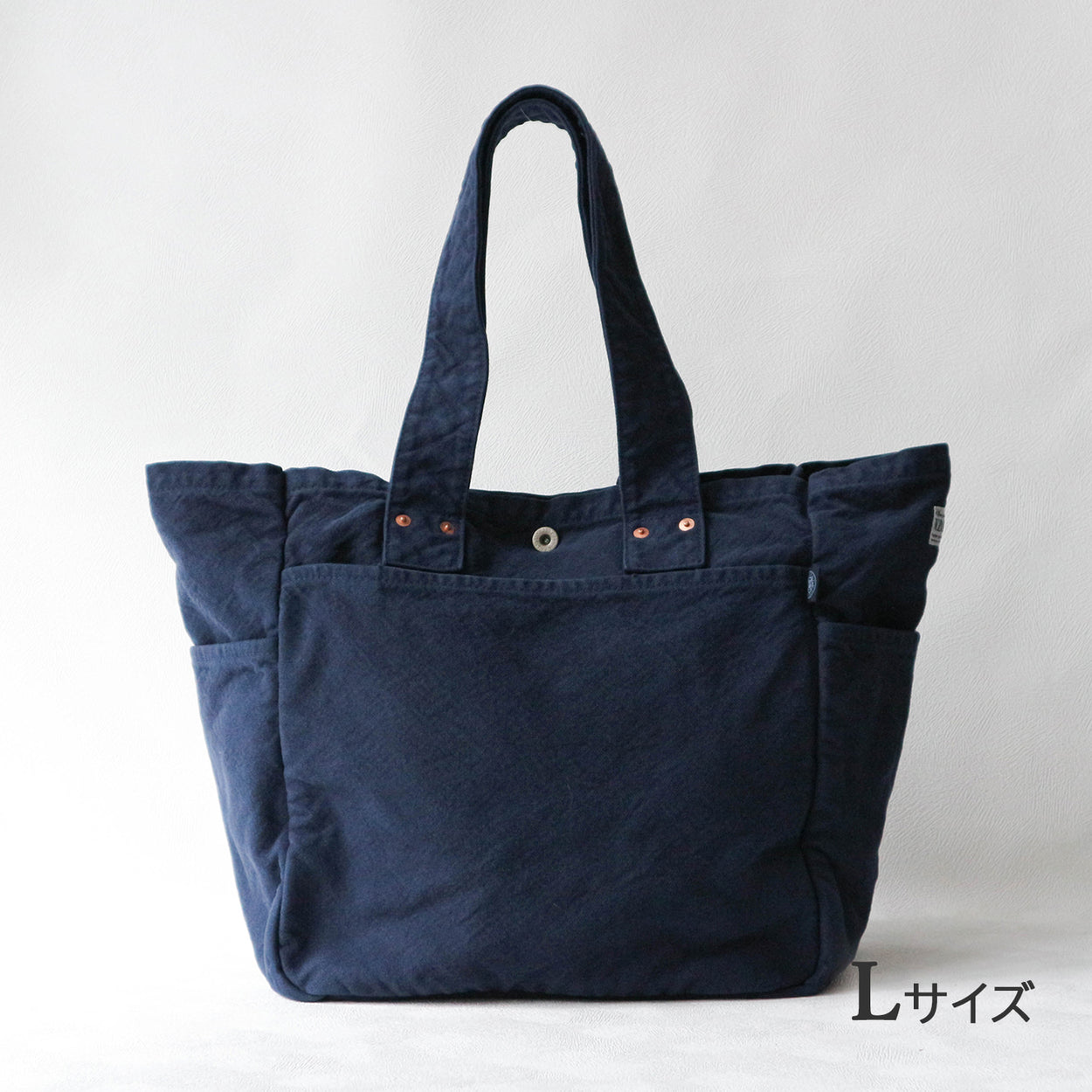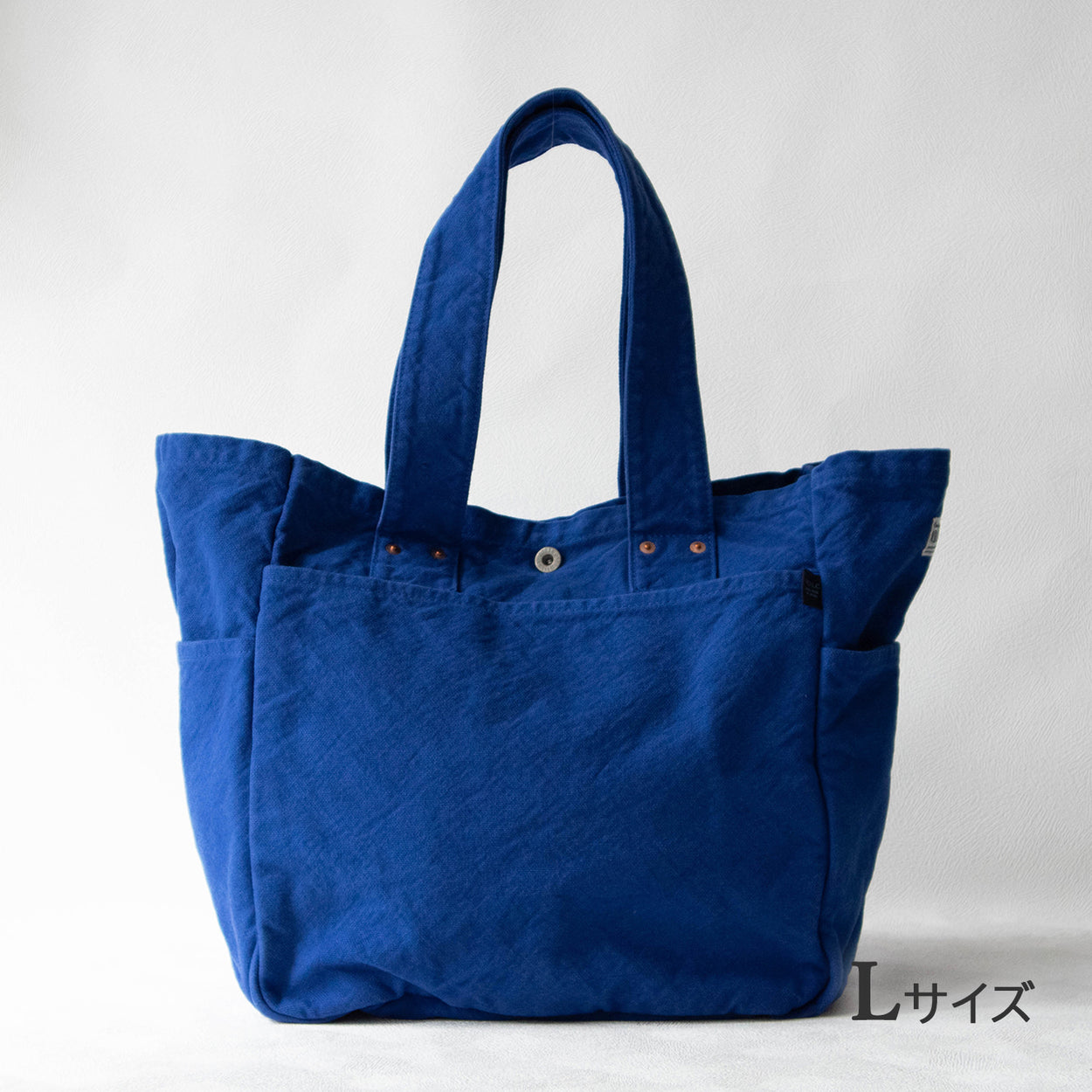 口が広く、大きなマチの大容量トートバッグ。 サイズ展開はS・Lの2種類。 カバン自体が軽く持ち手も十分な幅があり、痛くなりにくい工夫があります。外側に4つのポケットが付き。荷物の整理に活用して下さい。 Sサイズはスナップボタン、Lサイズはドーナツボタンを使用しています。