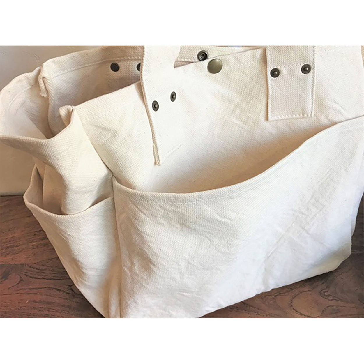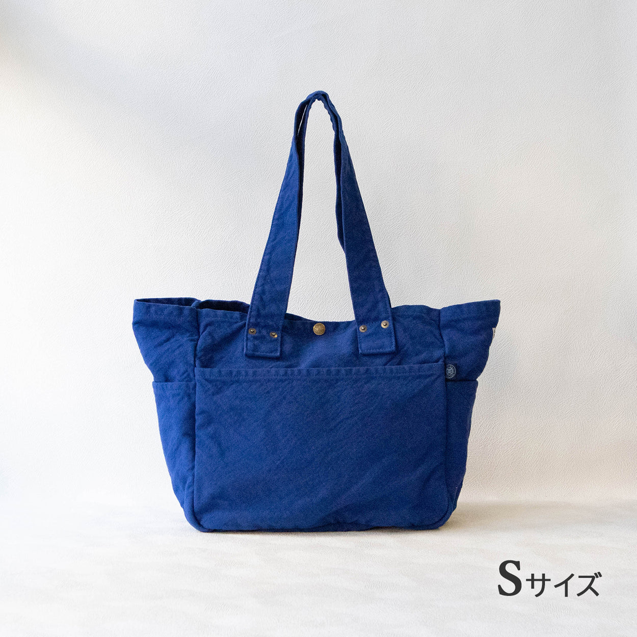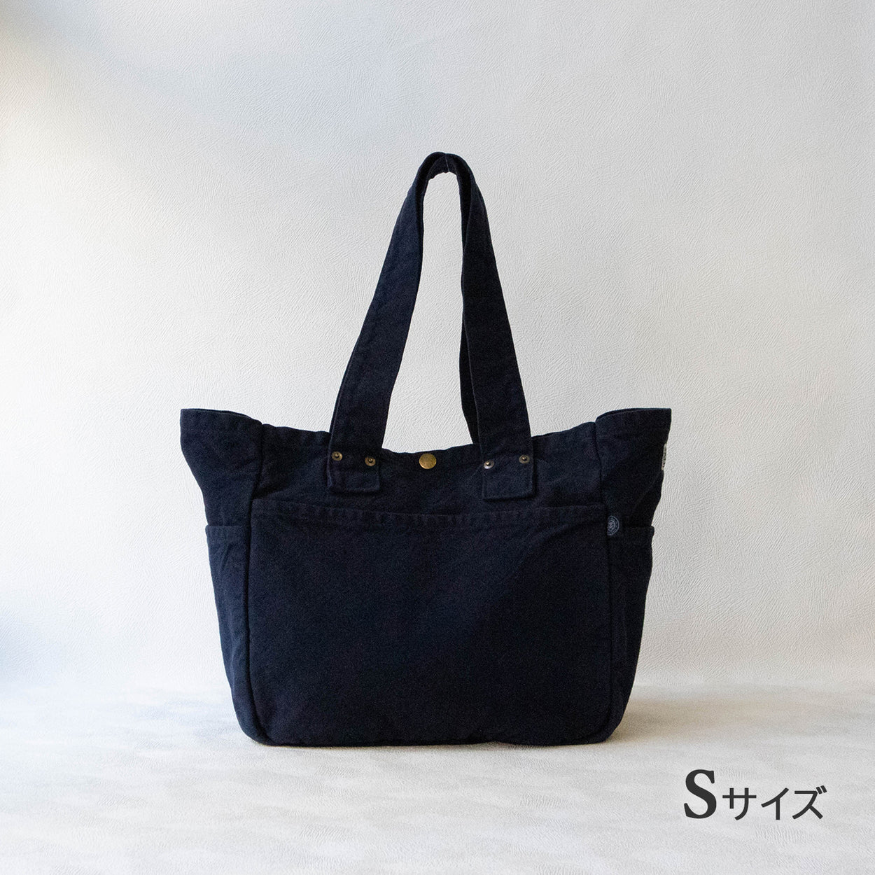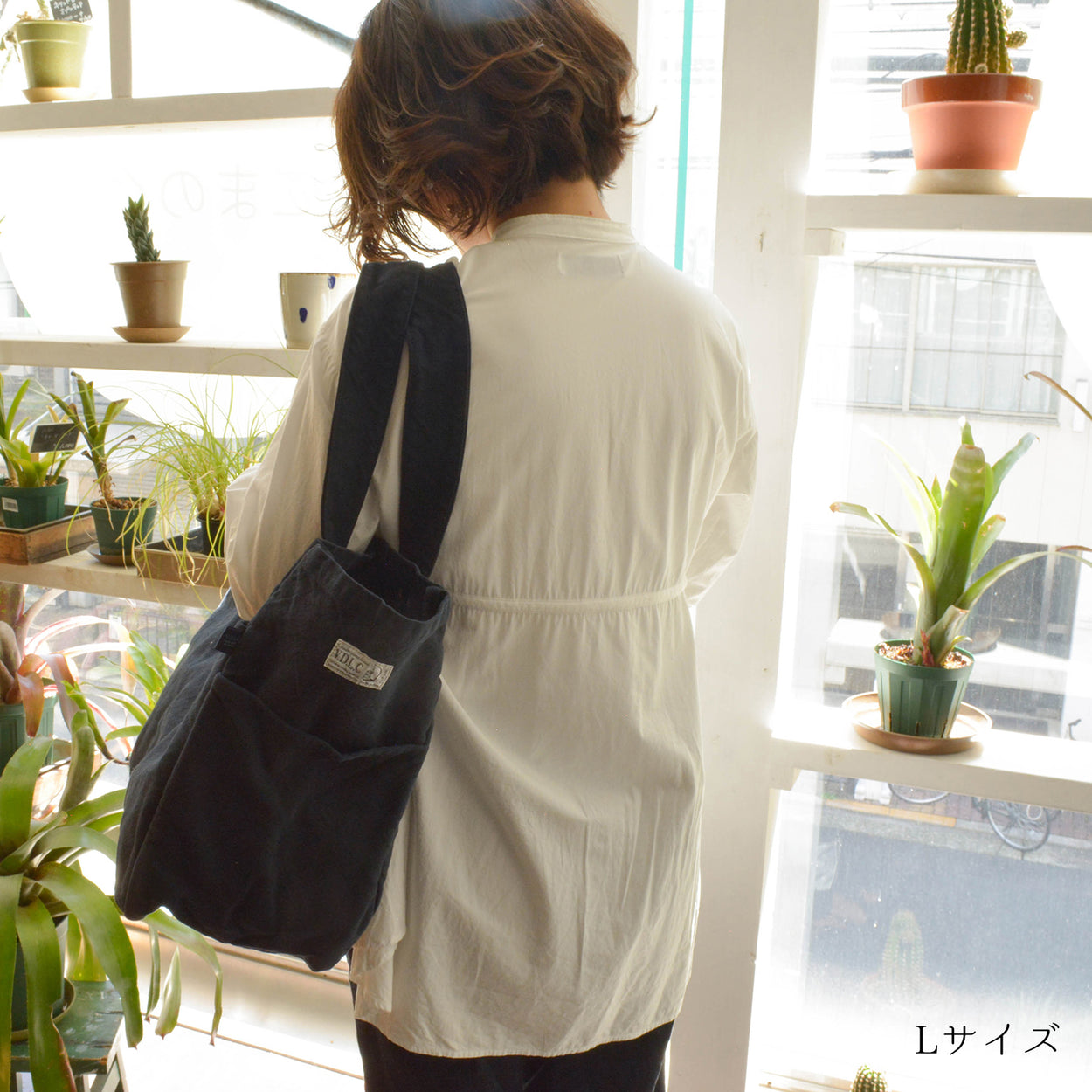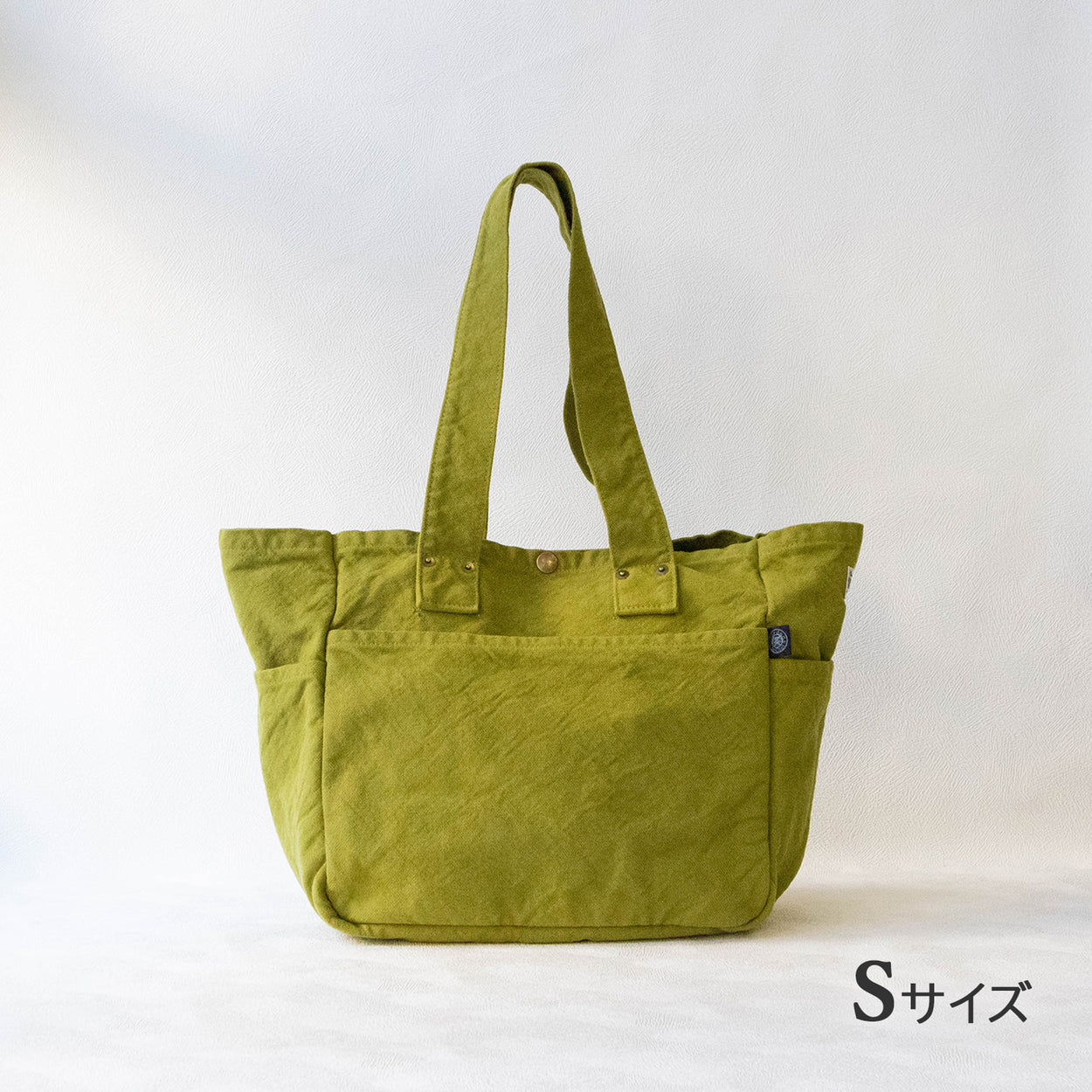 口が広く、大きなマチの大容量トートバッグ。 サイズ展開はS・Lの2種類。 カバン自体が軽く持ち手も十分な幅があり、痛くなりにくい工夫があります。外側に4つのポケットが付き。荷物の整理に活用して下さい。 Sサイズはスナップボタン、Lサイズはドーナツボタンを使用しています。