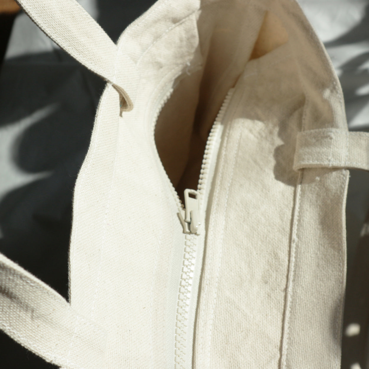 ジップ付きで安心感のあるシンプルなトートバッグ。500mlのペットボトルも入る大きなポケットもあってとっても便利。A4サイズがすっぽり入って軽いので、どこに行くにも使いやすいショルダーバッグです。
