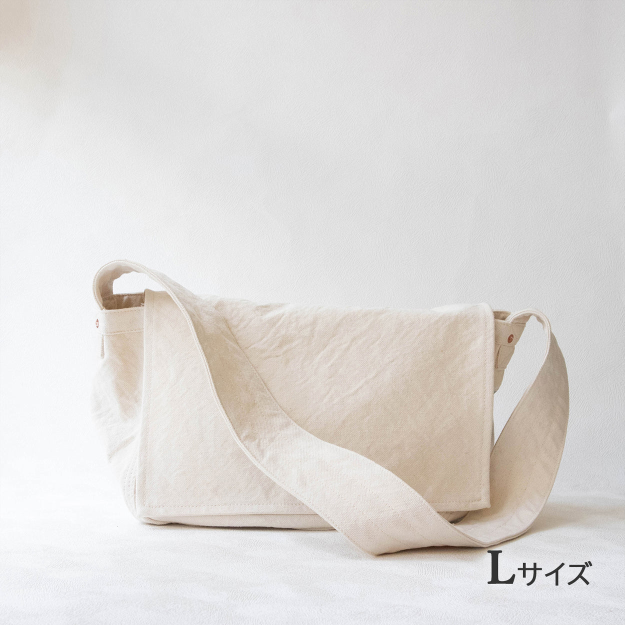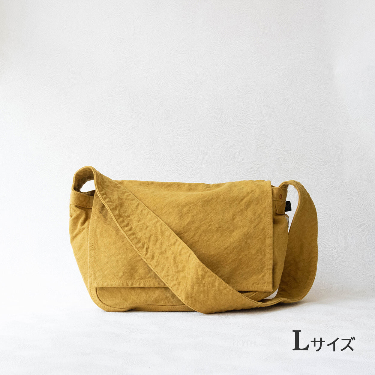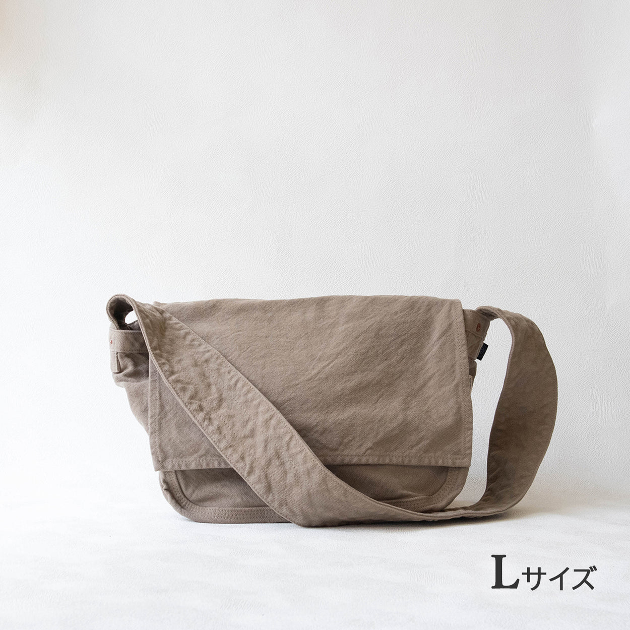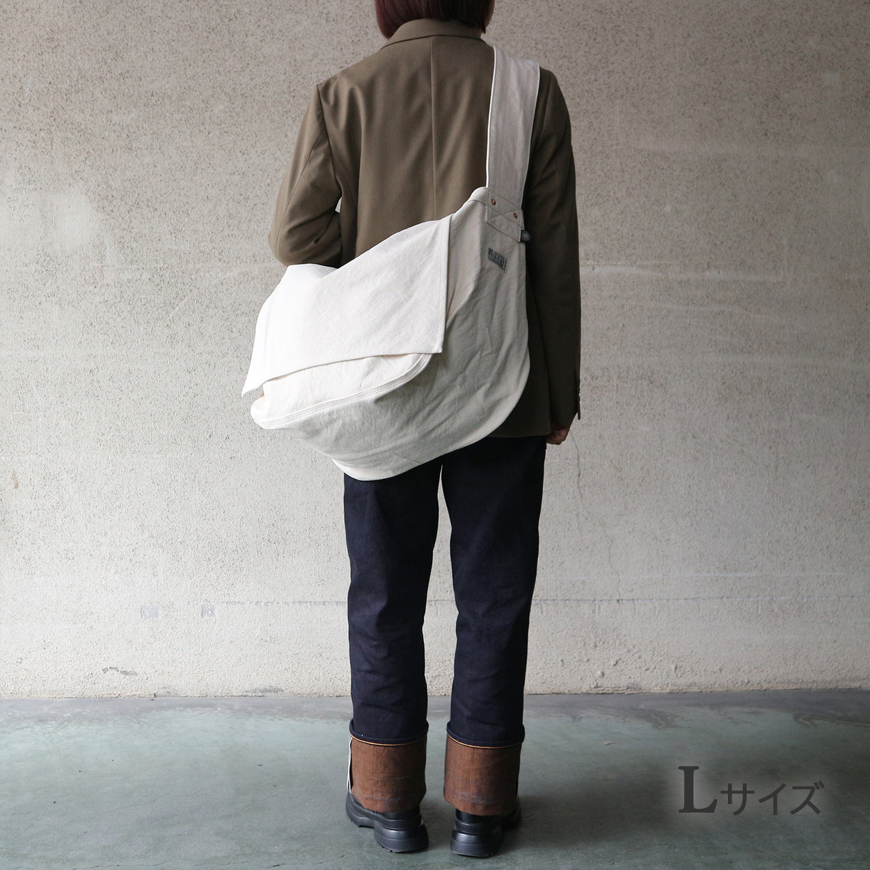 LサイズとMサイズの二種類。大きな口と、広いマチの丈夫なバッグです。極太のショルダーひもに入ったステッチもポイントです。--------【L】サイズ---------